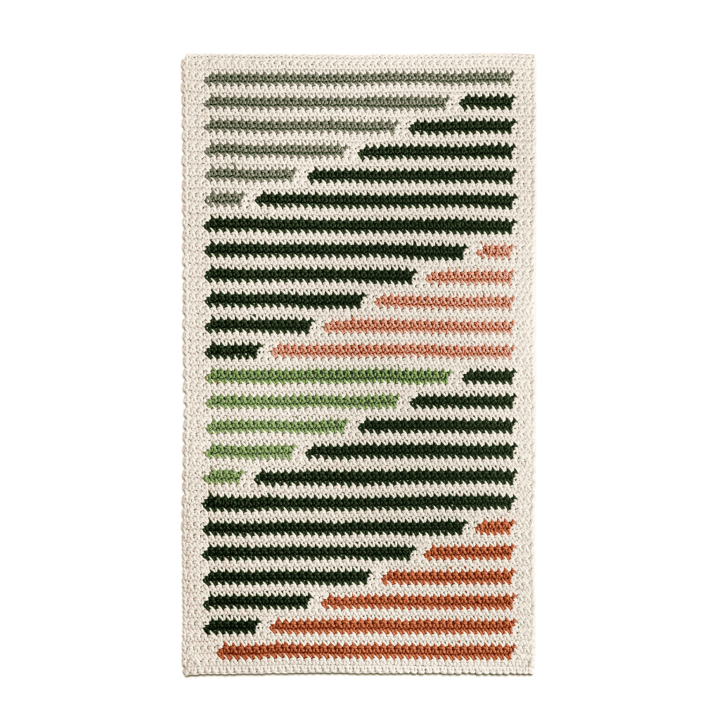 Esta alfombra ecológica de 100% algodón, inspirada en la flora y el paisaje de los Abruzos, está tejida a mano con la técnica del crochet a partir de cordones de algodón de alta calidad hechos de algodón reciclado sin ningún tipo de uso de tintes o tóxicos.
