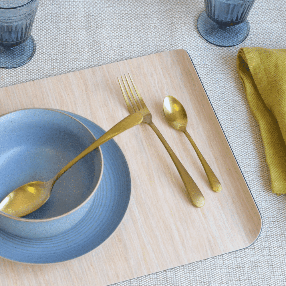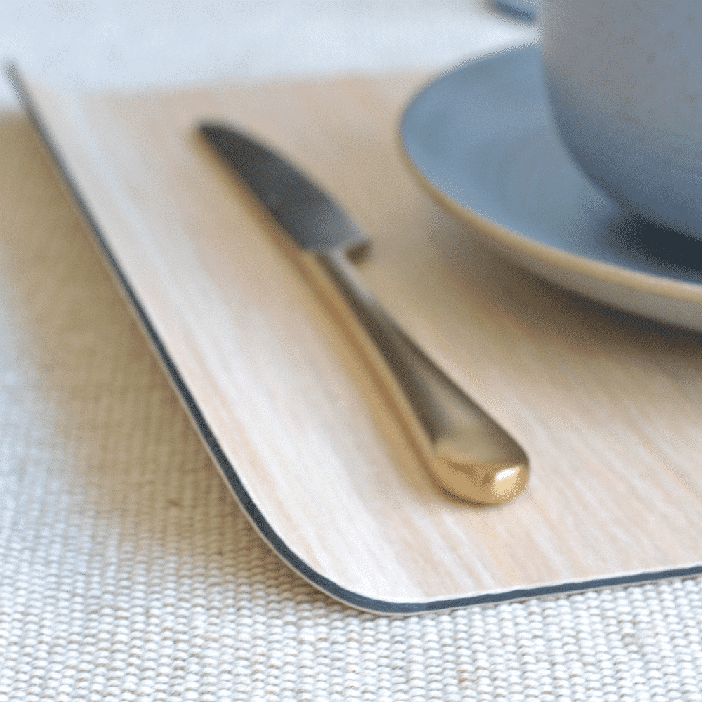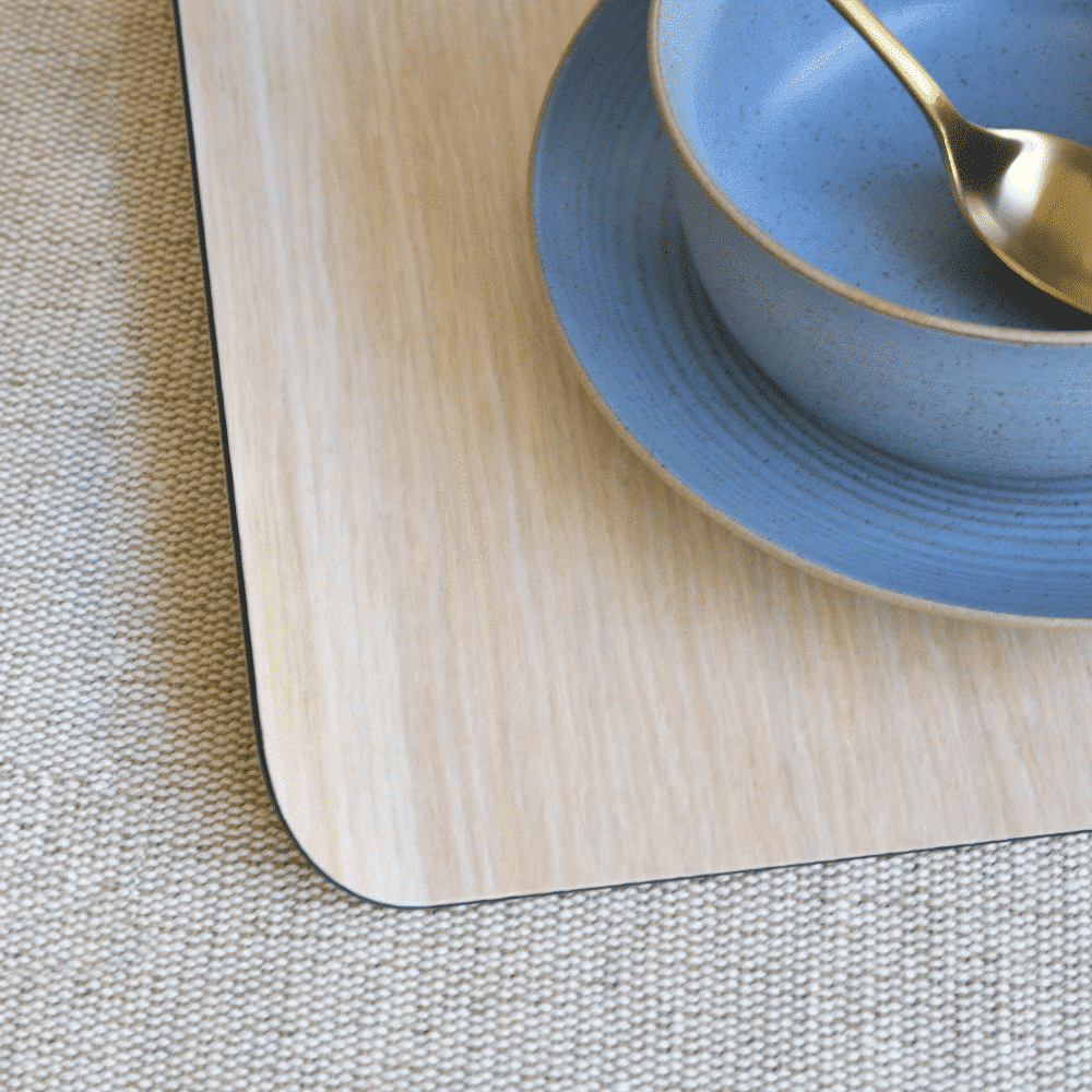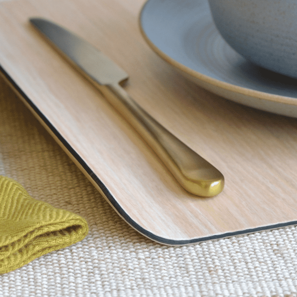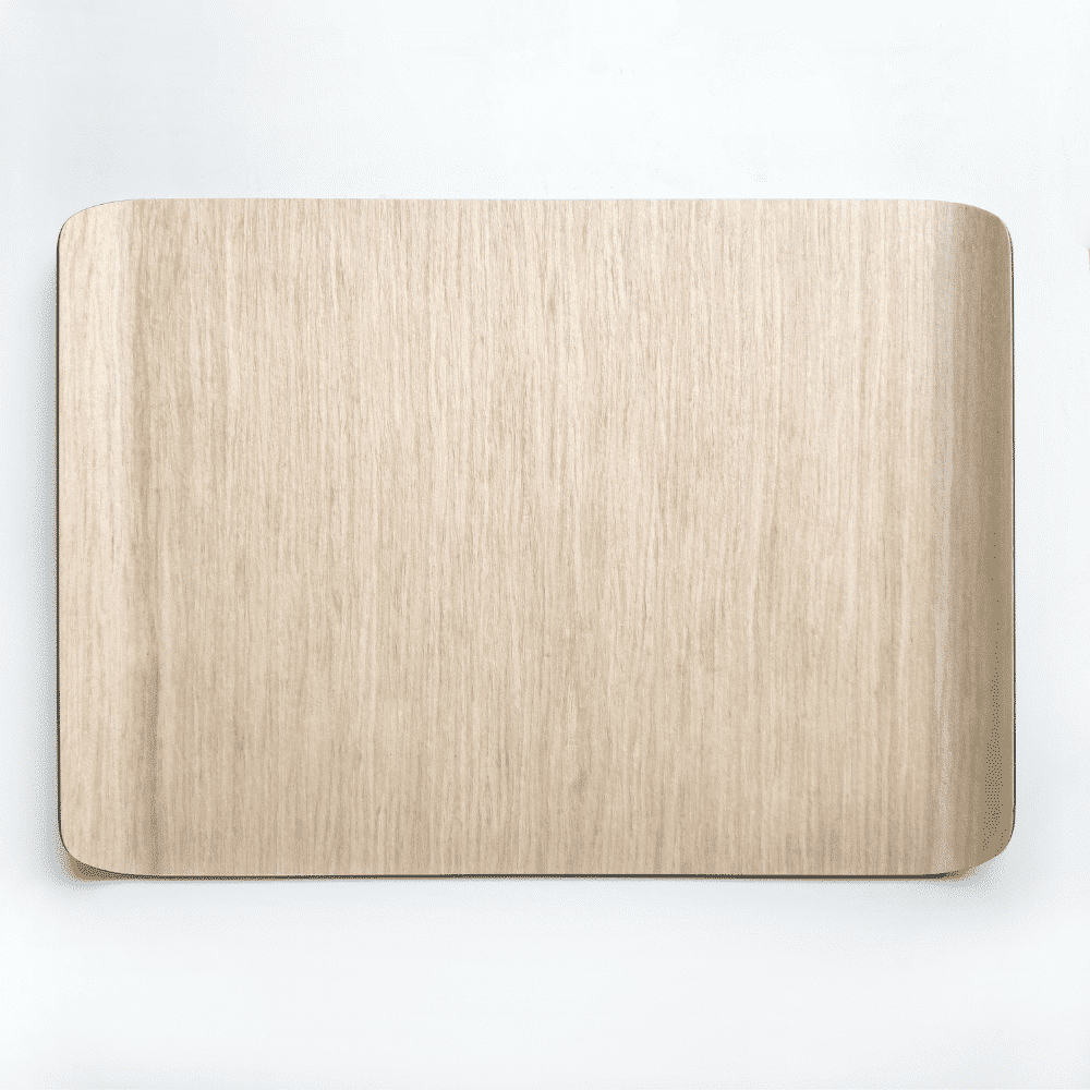 Te permite transportar comida y bebida al sofá o a la terraza sin que se caiga o derrame. Realizada con chapa de madera natural y tratada con resinas y baquelita en el interior. Se puede lavar a mano con estropajo y paño húmedo.
