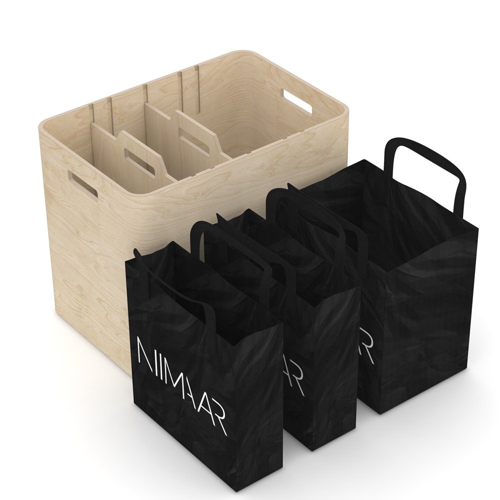 Las tres bolsas están disponibles con el logotipo de Niimaar o con la ilustración japonesa de Yoshi Sislay. Las bolsas son muy duraderas e hidrófugas. Todas las bolsas son negras con texto o ilustración en blanco. El material reciclable tiene un revestimiento que hace que las bolsas sean especialmente repelentes al agua y la estructura especial de la superficie hace que las bolsas sean muy elegantes. Las bolsas están especialmente diseñadas para combinar con el Ecosmol y el Ecomini, pero también pueden utilizarse por separado, como elegantes bolsas de mano.