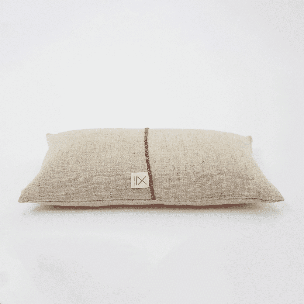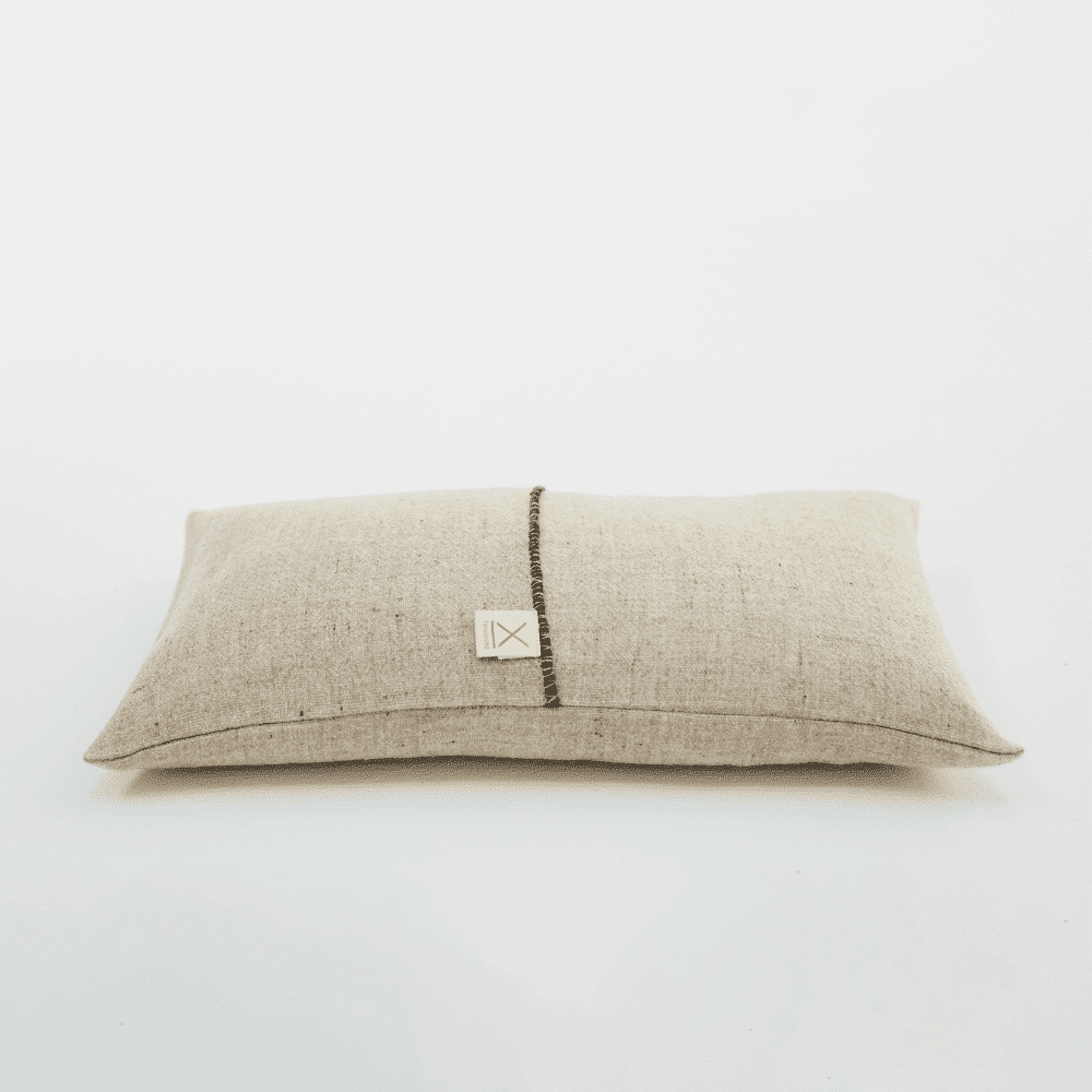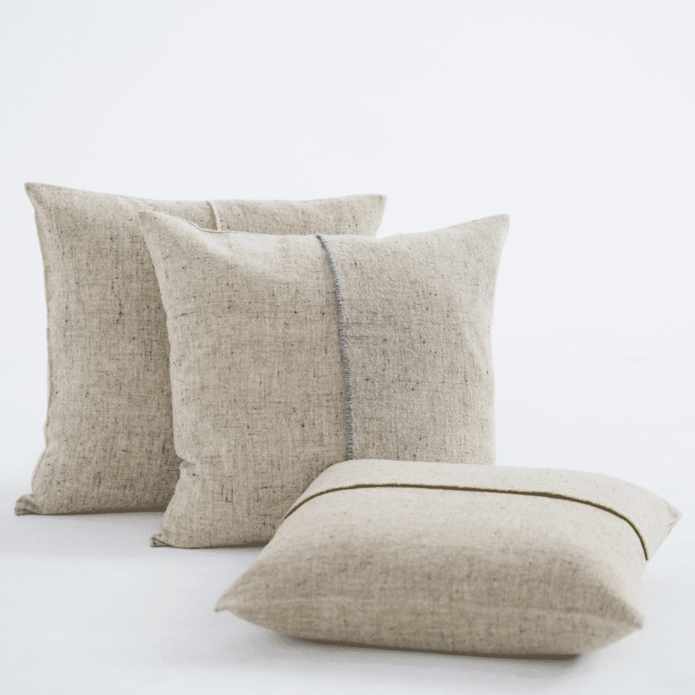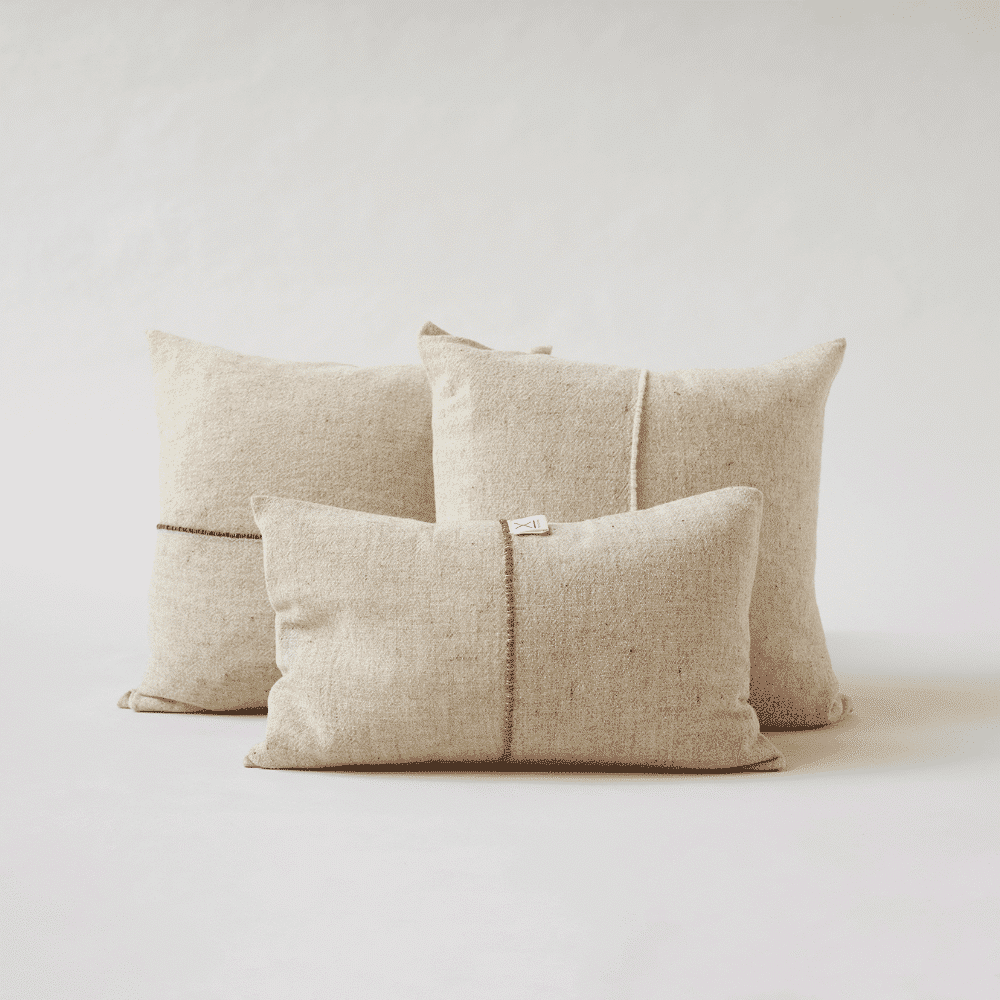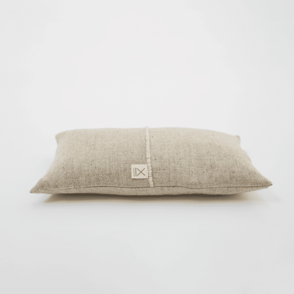 El cojín icónico Sisteron de lana merina en su base es de color blanco grisáceo. Tiene un aspecto natural y suave debido al propio color y textura de la lana. Los perfiles de distintos tonos en tinte vegetal ofrecen la posibilidad de combinarlos en cualquier espacio