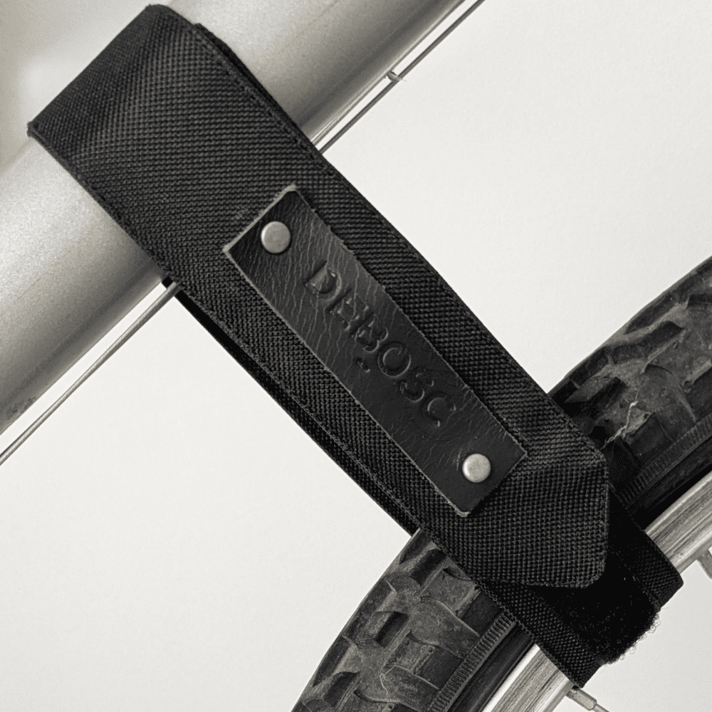 La correa, diseñada y fabricada de manera local en Anglès (Girona), es de tela impermeable con cierre de velcro y fija la rueda al tubo diagonal del cuadro, de modo que inmoviliza la rueda y el manillar.