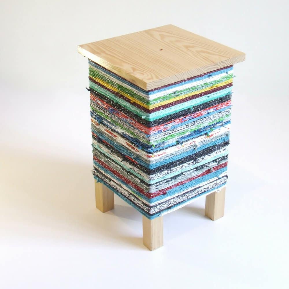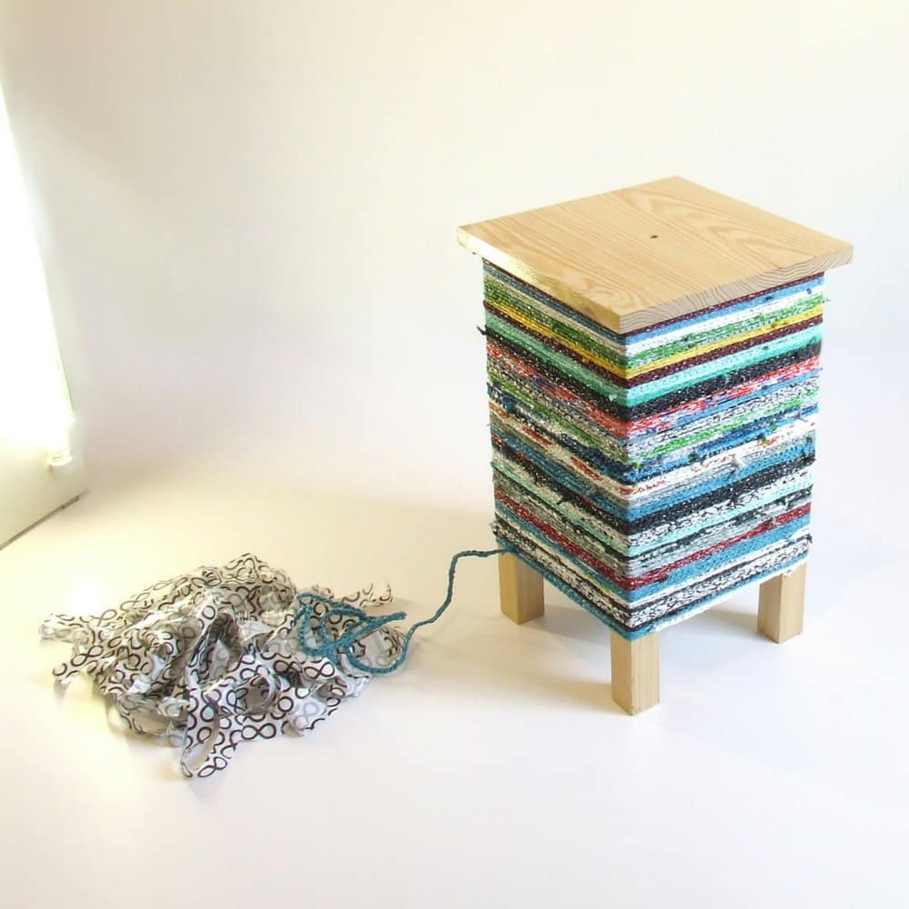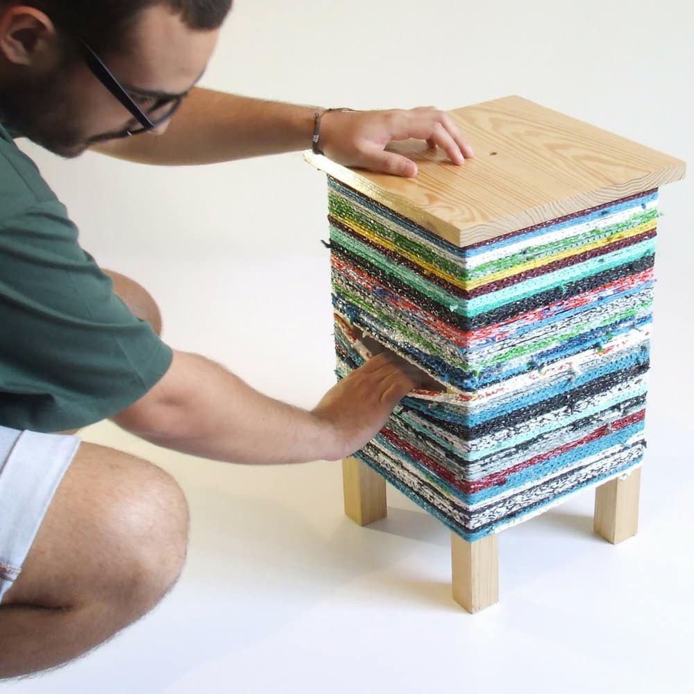 Mesa de madera de pino inspirada en los taburetes tradicionales portugueses y en el arte del crochet.