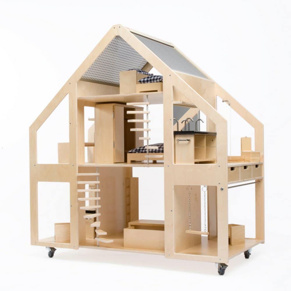 Casa de muñecas altamente sostenible diseñada para enseñar a los niños interacciones sociales, confianza y responsabilidad medioambiental a través del juego. Disponible para su compra con o sin muebles.