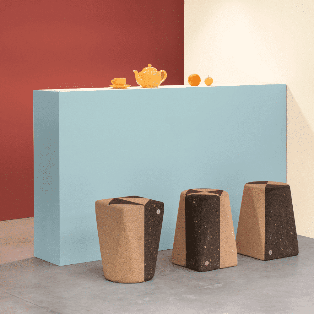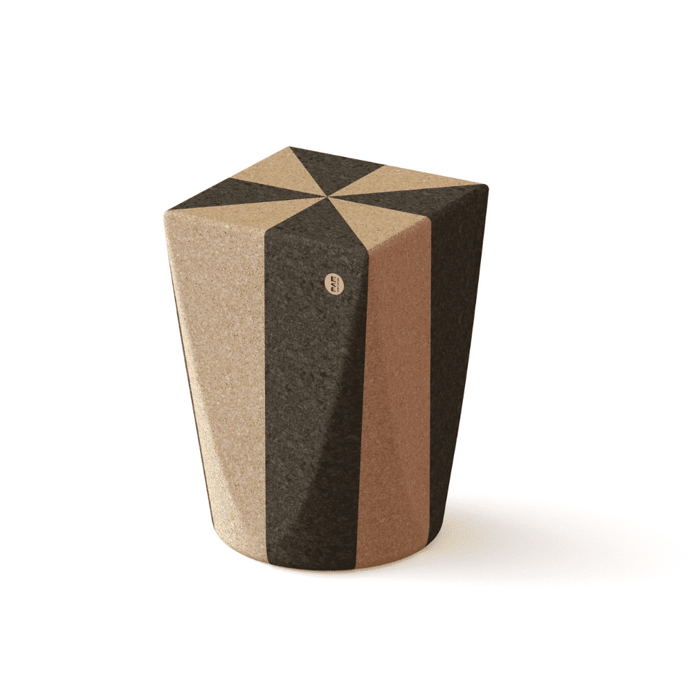 Con un fuerte carácter geométrico, el taburete o mesita de apoyo DUO es un fantástico diálogo entre el corcho claro y el oscuro.