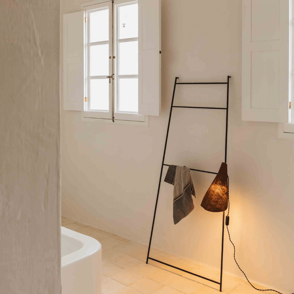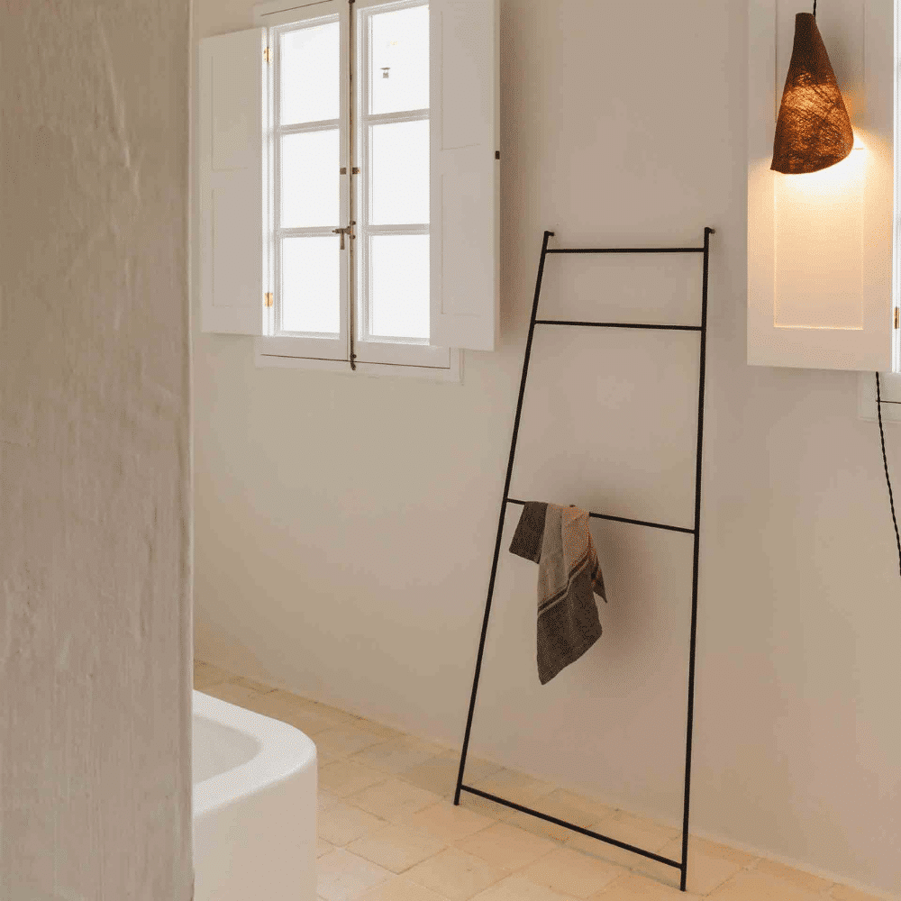 Escalera decorativa de hierro con un diseño minimalista y contemporáneo, realizada artesanalmente por expertos artesanos. Se puede utilizar para colgar toallas en el baño o para maceteros y mantas en el salón u otra estancia de la casa.