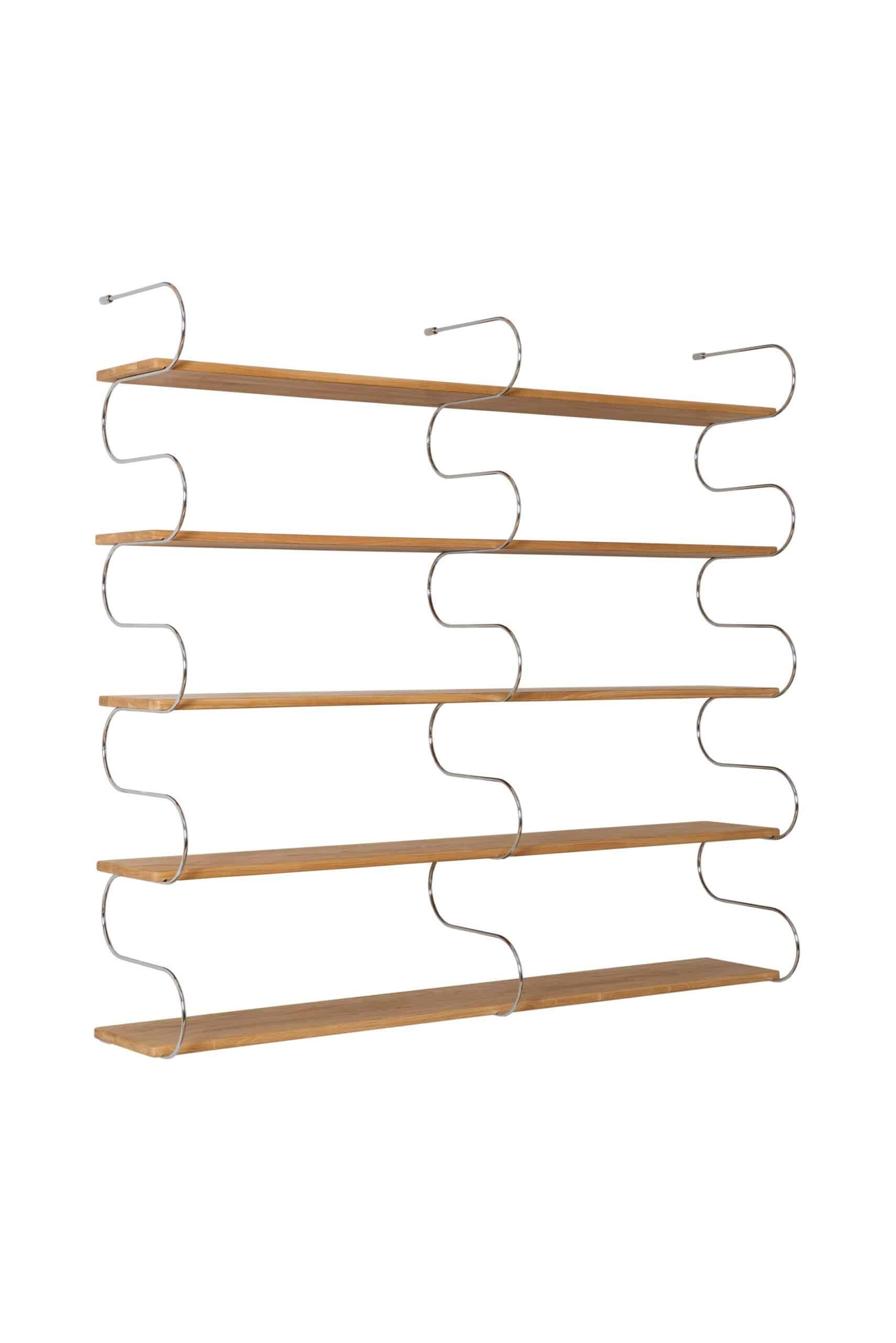Los estantes son de madera de roble y están disponibles en dos longitudes diferentes. Mediante un pequeño fresado en la parte inferior, pueden colocarse fácilmente en el marco lacado en negro o cromado. De este modo, los estantes pueden combinarse individualmente con los paneles de pared, que vienen en dos alturas diferentes, y utilizarse para innumerables propósitos.