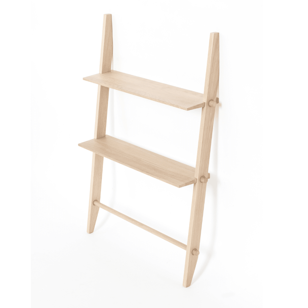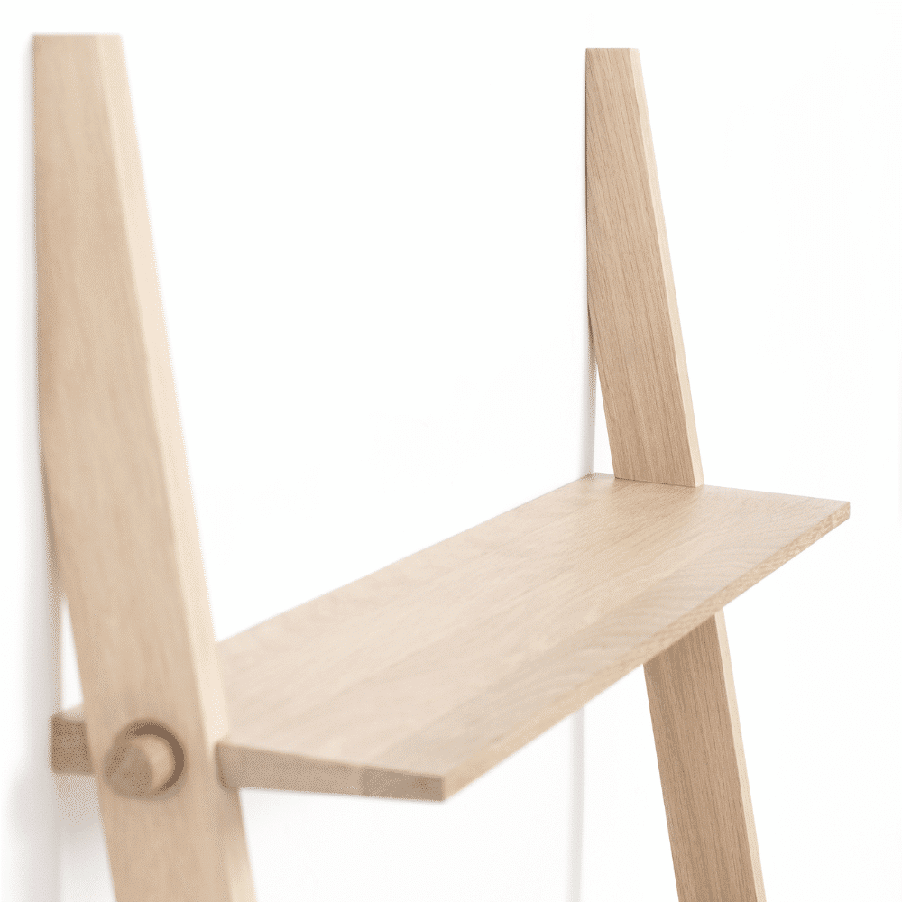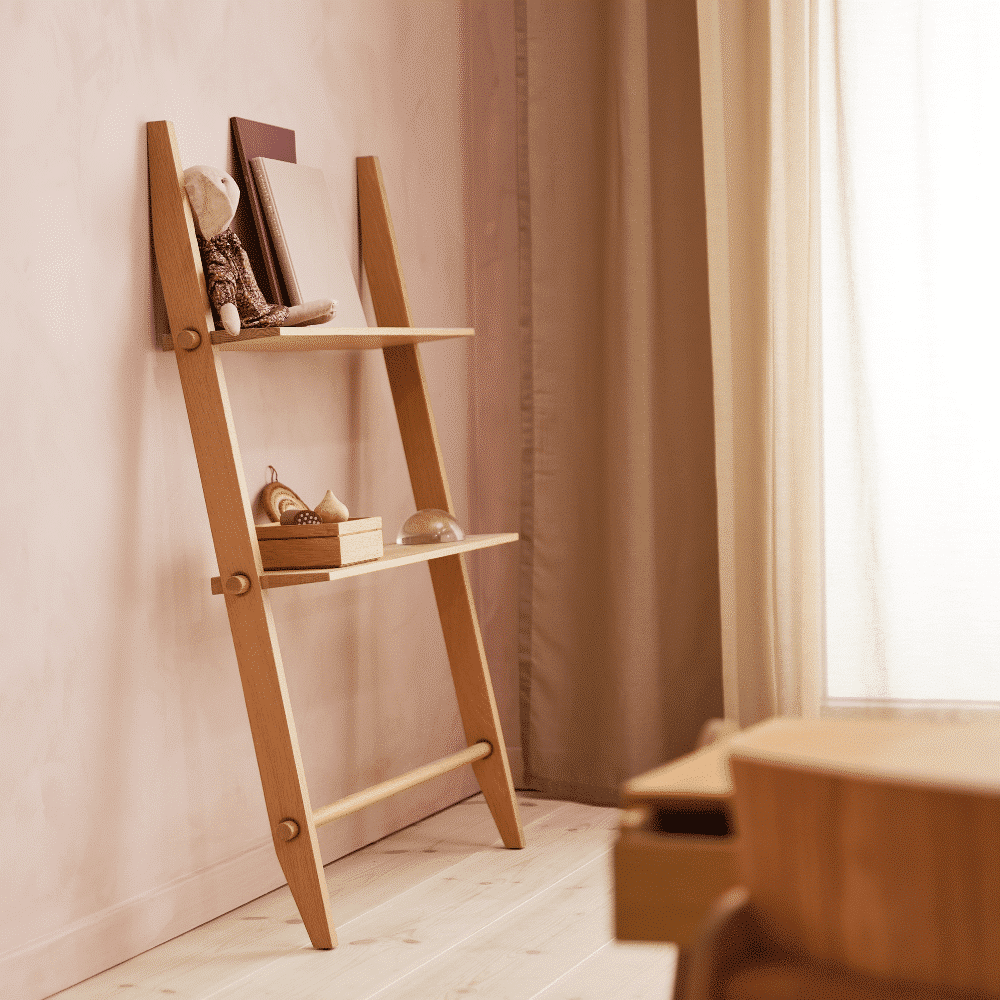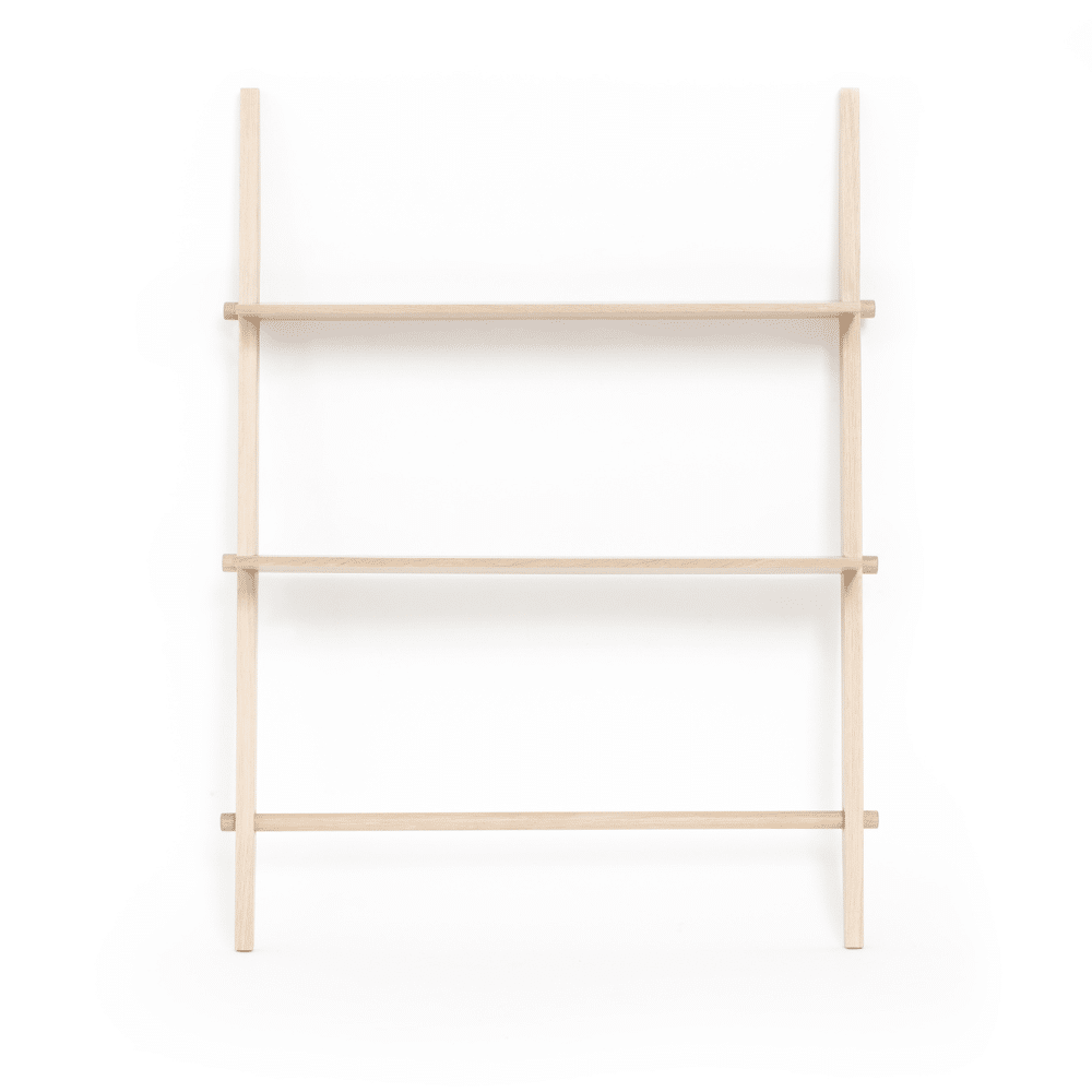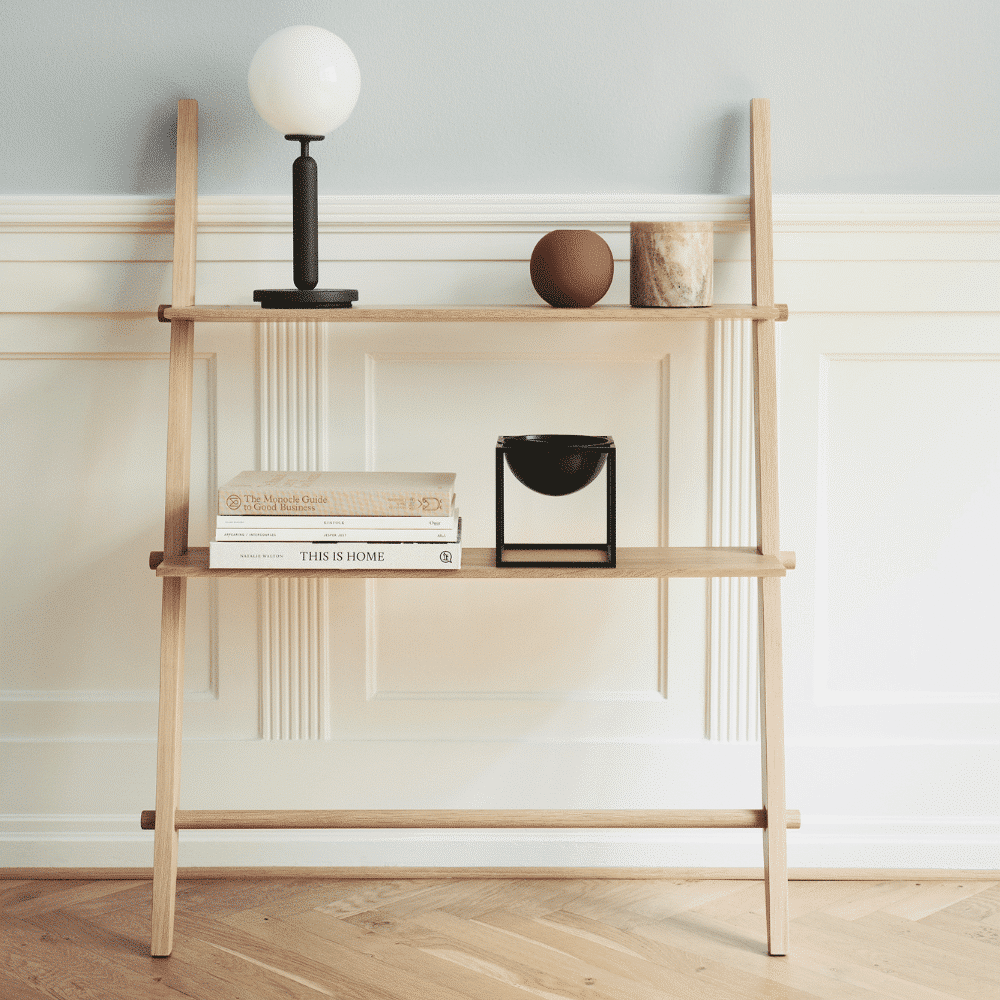 Esta pieza única está diseñada para estar en el suelo, apoyada contra la pared. Su estabilidad elimina la necesidad de hacer agujeros antiestéticos en la pared, lo que la convierte en una adición libre de complicaciones a tu decoración. Elaborada en roble, Repó no solo ofrece almacenamiento práctico, sino que también añade un toque de elegancia natural a tu hogar.