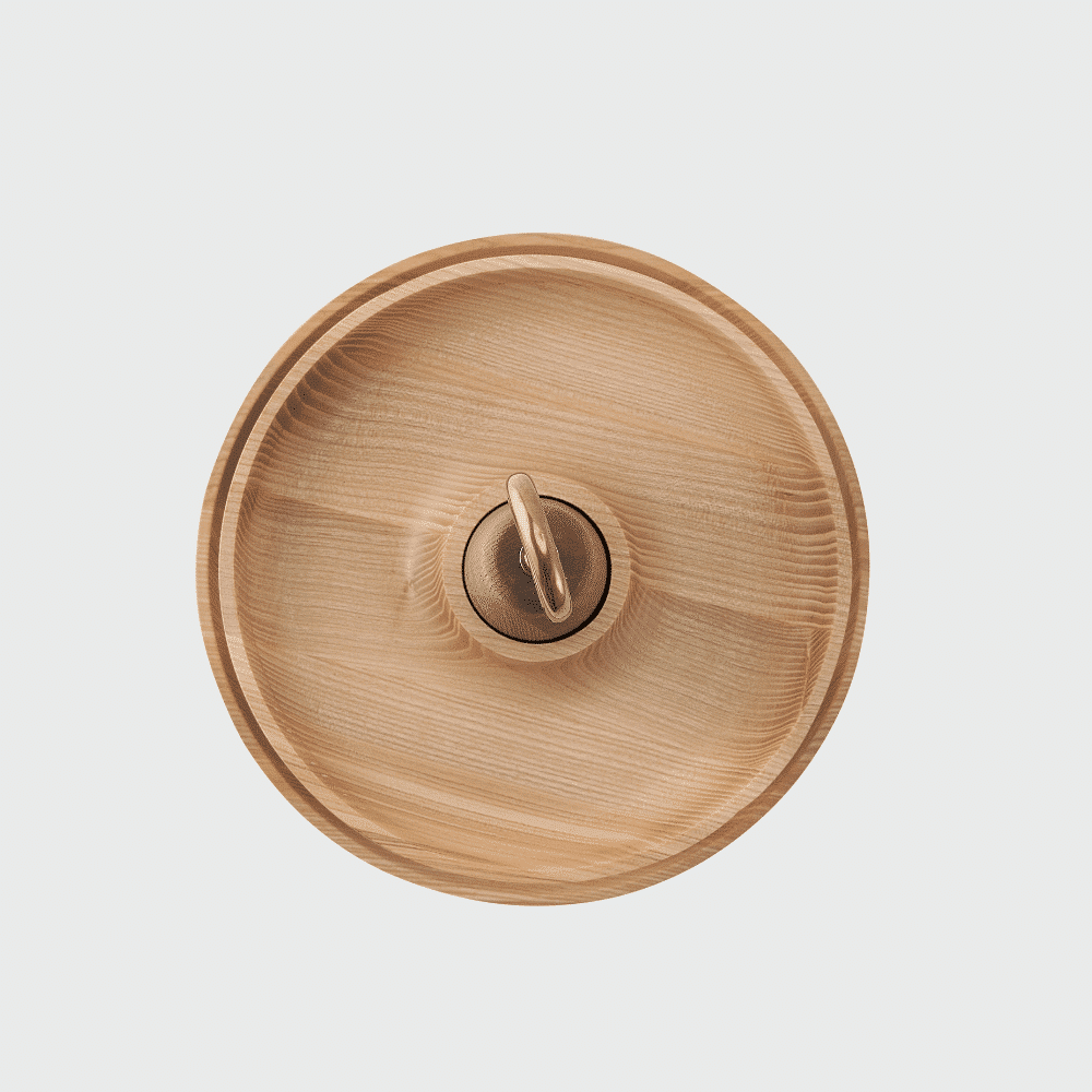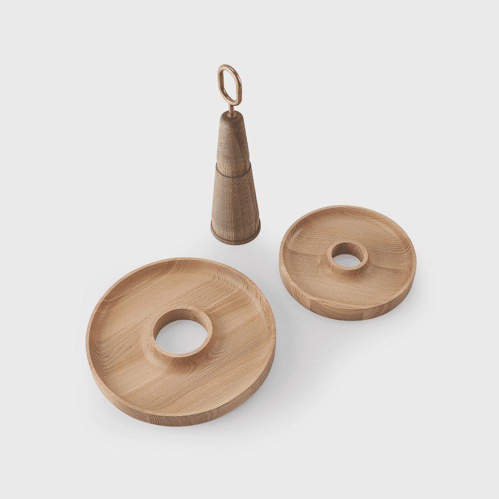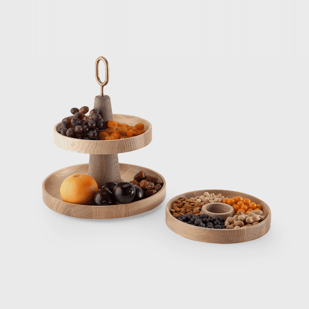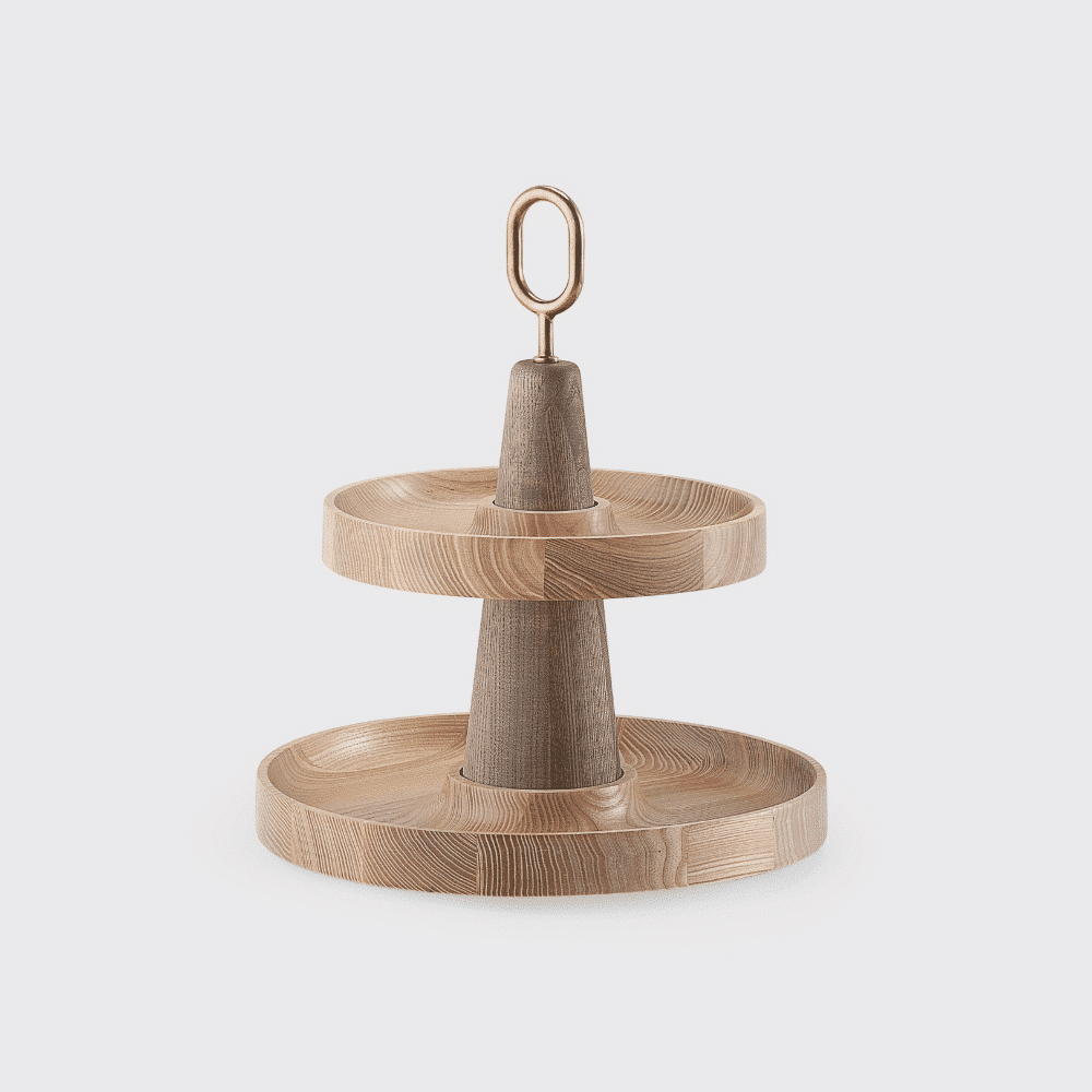 La creación de este moderno y elegante soporte para servir Babel se inspiró en el juego infantil «Lanza un anillo». Se trata de una composición de dos platos de madera con forma de cuchara y un poste central combinado con un mango de latón macizo. Al igual que en el juego, los platos se desmontan fácilmente y se pueden utilizar por separado, para luego volver a montarlos en el poste central. Todas las piezas de madera de Babel están fabricadas con precisión a partir de fresno macizo y acabadas con aceite certificado para el contacto con alimentos.
