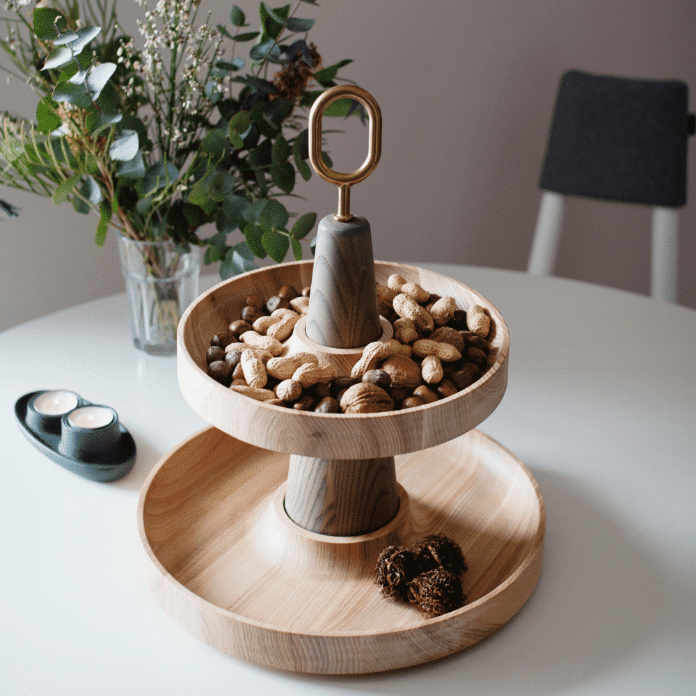 Babel se convertirá fácilmente en una parte de su vida diaria con un uso para frutas, frutos secos, chocolates y más. Los platos también se pueden voltear cuando se necesita la superficie plana, por ejemplo, para servir las magdalenas. Este material artístico encaja perfectamente en cada hogar gracias a su diseño minimalista y a los cálidos materiales utilizados.