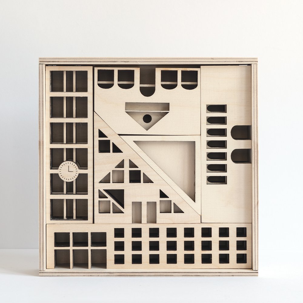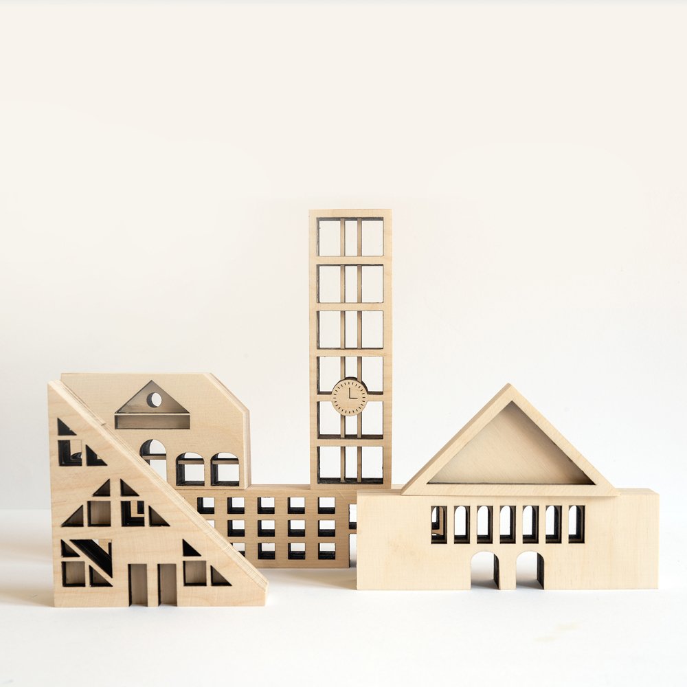 Rompecabezas cuadrados, que funcionan como juguetes y objetos de diseño, pero que también pueden presentarse como una obra de arte, en la que los componentes estéticos de la forma y la forma han sido el centro del diseño. El edificio cambia de carácter dependiendo de cómo se monten las piezas, y tanto niños como adultos pueden disfrutar creando sus propias construcciones. Los bloques están hechos de madera contrachapada de abedul 100% sostenible y certificada hecha a mano en nuestro estudio de Amager. Ayuntamiento de Aarhus, El iceberg, Grandes Almacenes Illums, Teatro de Aarhus.
