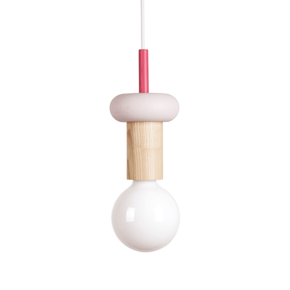 Los diseñadores de las lamparas Niklas Jessen y Julia Mülling crearon 5 versiones de la lámpara Junit de acuerdo con su propio sentido estético de la forma. La iluminación «Drop» consta de 3 elementos: un zócalo con acabado claro, una pieza de color rosa pastel y un elemento de color magenta en la parte superior. El color del cable textil es blanco.