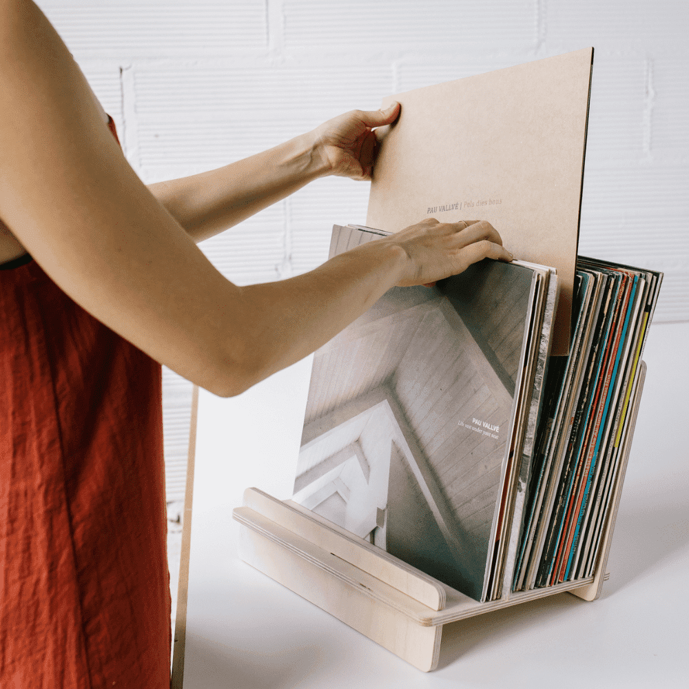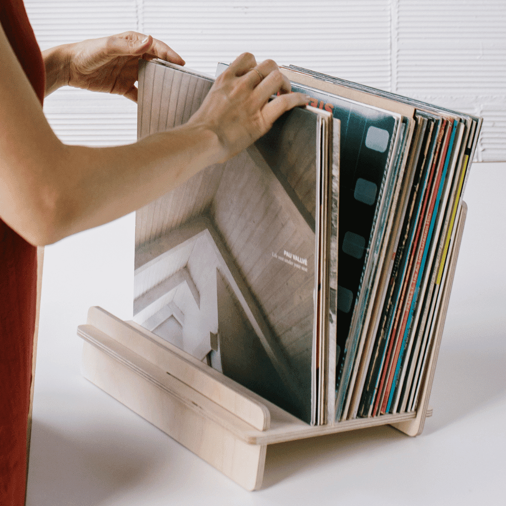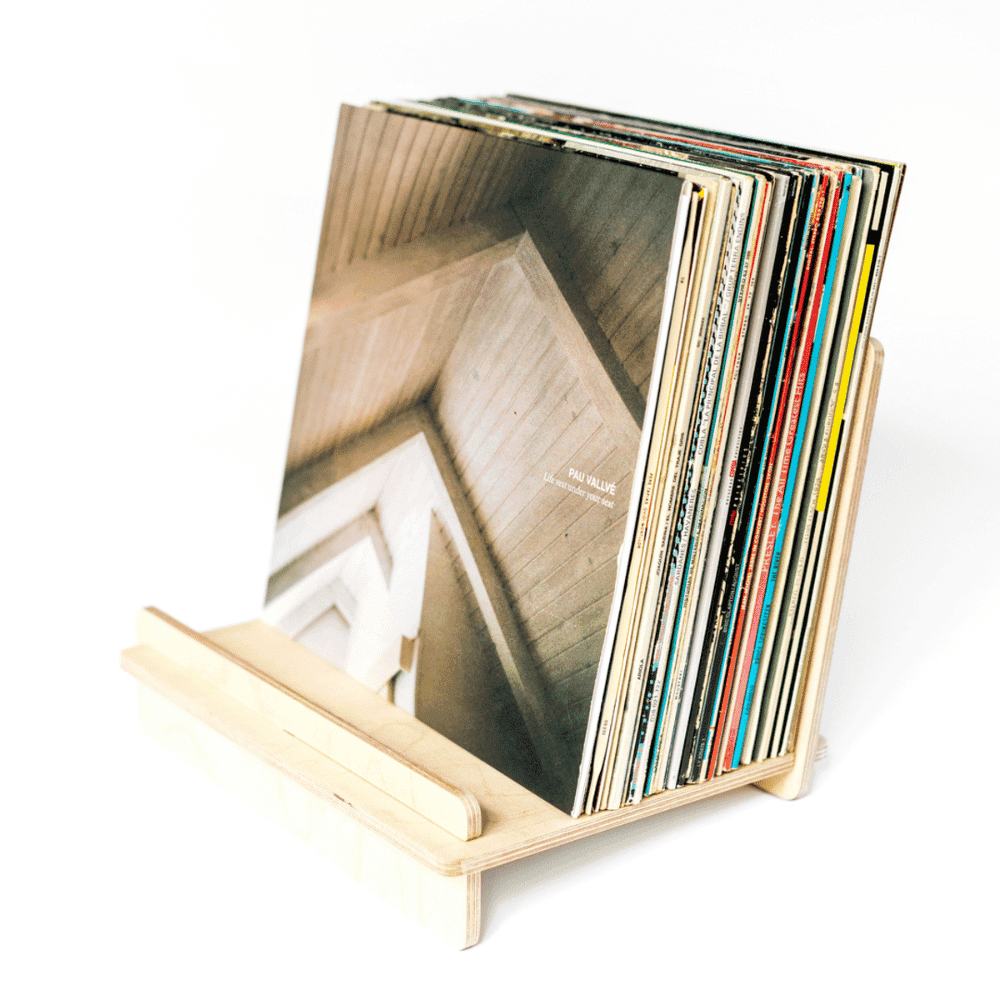 La Gatzara es un soporte desmontable para vinilos. Caben unos 50 LPs y tiene una pequeña inclinación para que se apoyen en la parte posterior del atril y para facilitar la búsqueda de discos. También se puede utilizar para almacenar y exponer una pequeña cantidad de libros infantiles, de cocina, etc