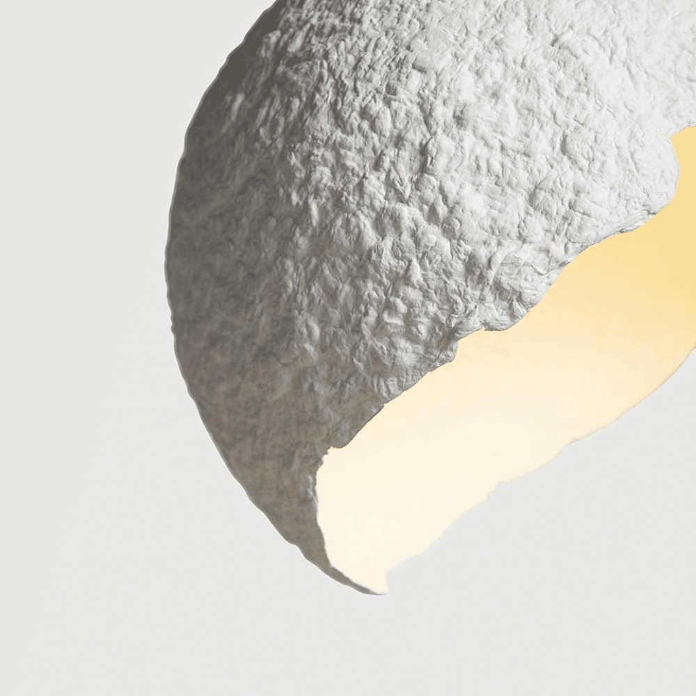 Esta lámpara colgante de techo está realizada con periódicos despulpados, pigmentos naturales para colorearla, pegamento sostenible a base de agua y cable textil de un metro. Su estructura porosa e irregular simboliza el suelo, seco y agrietado, una elección poética inspirada en las pinturas del polaco Grupa Nowohucka.