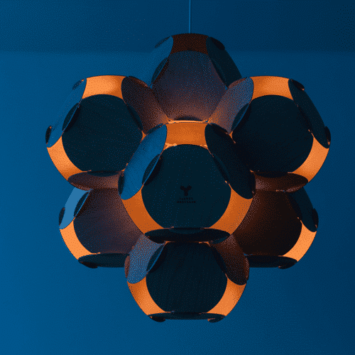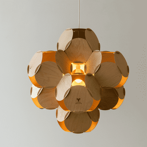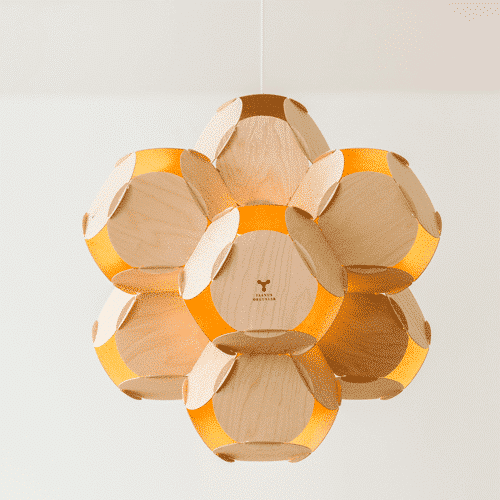 La lámpara está construida con círculos de madera contrachapada del mismo tamaño que se entrelazan entre sí y están fijados por una espiga única de fijación rápida. La composición de 9 cámaras está iluminada por una fuente de luz en el centro.