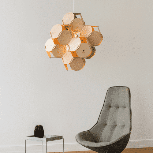 La lámpara colgante 8 células es una luz de ánimo que abre nuevas vistas y dimensiones en diferentes partes de la habitación, desde cubos o estrellas hasta tetraedros. La madera semi-transparente y la estructura de la lámpara crean un ambiente acogedor.