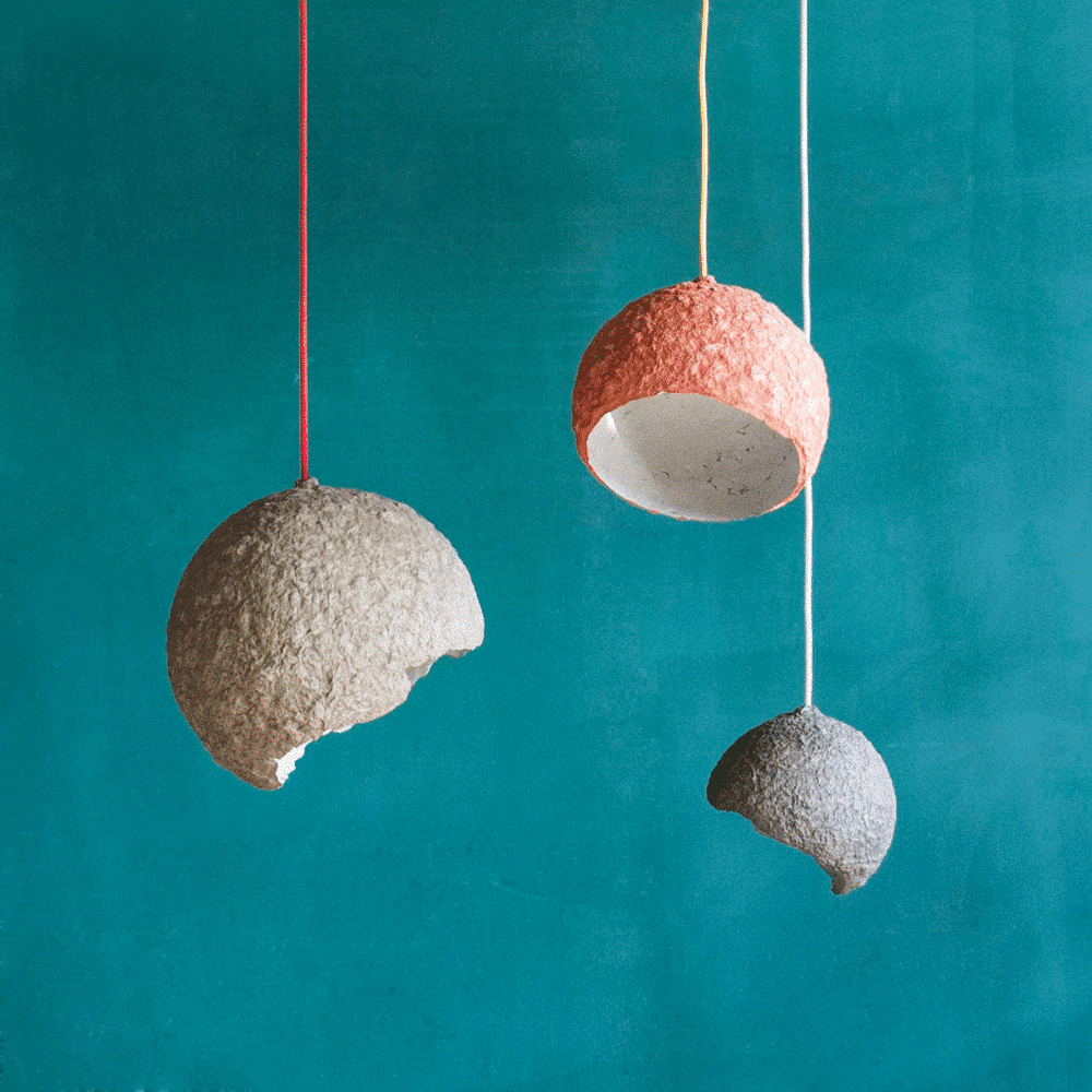 Dentro de los materiales que componen a estas lámparas colgantes sostenibles, el principal es el papel maché que se obtiene con periódicos reciclados despulpados y pegamento a base de agua, de ahí su ligereza. El papel se rompe en pequeños pedazos que, en alta temperatura, vuelven a unirse en una entidad nueva sostenible y completamente diferente. Así, el papel se puede moldear posteriormente de muchas maneras diferentes creando la forma de la lámpara colgante buscada.