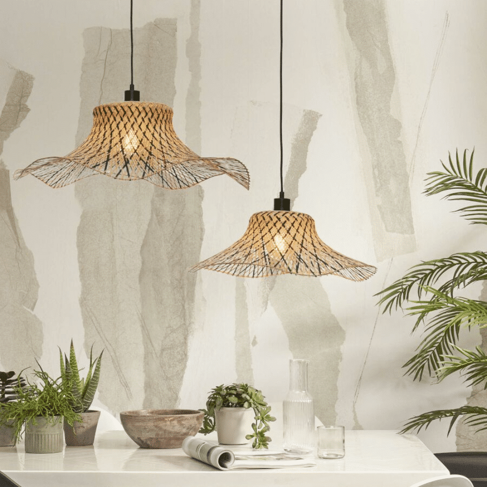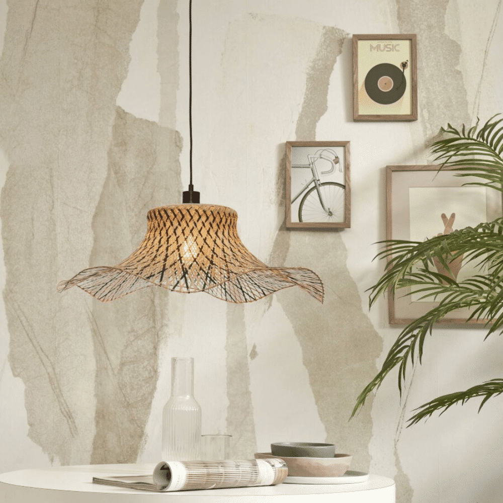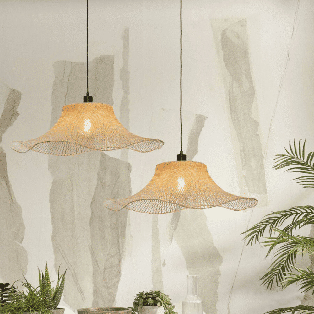 La lámpara de techo colgante Ibiza está hecha de bambú y tiene una forma elegante que simula un sombrero.