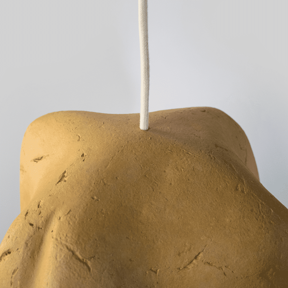 La lámpara colgante Peonia está hecha a mano con pulpa de periódicos.
