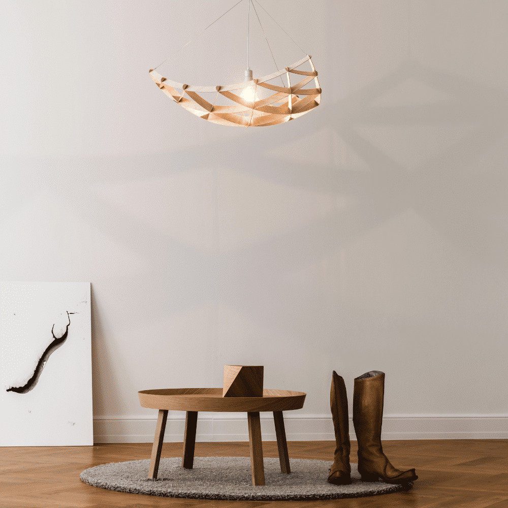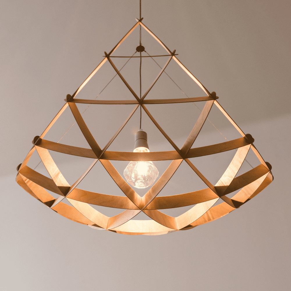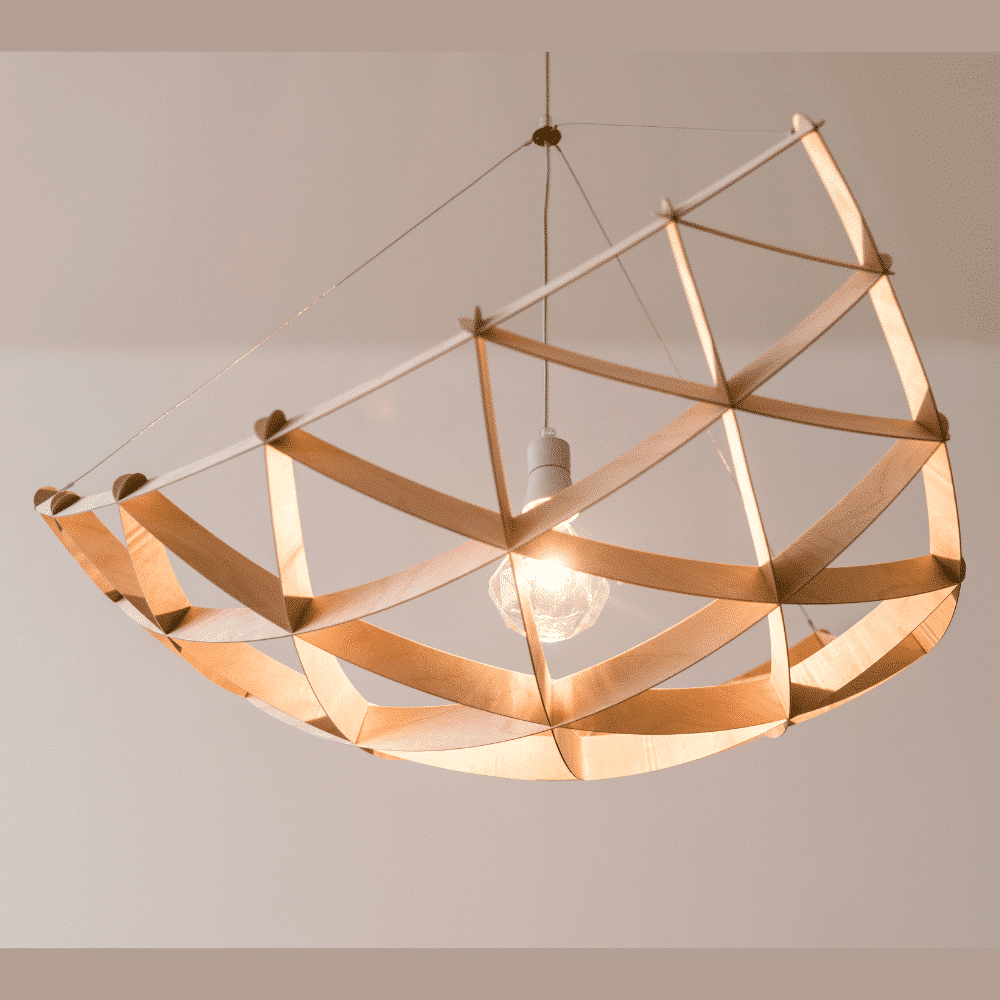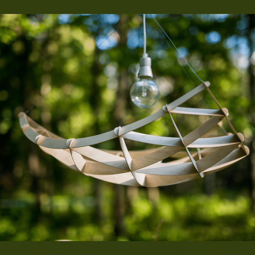 La geometría de la lámpara colgante RAI es aérea y elegante, está ensamblada sin pegamento por un sistema de unión especial. Los arcos se han cortado de un fino contrachapado de aviación de una sección muy pequeña de contrachapado hoja de madera.