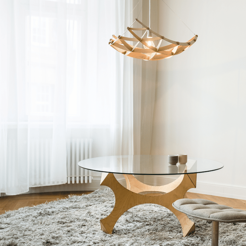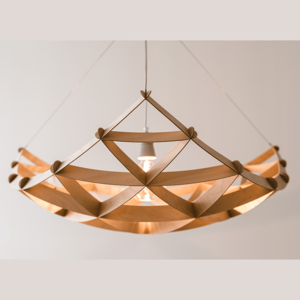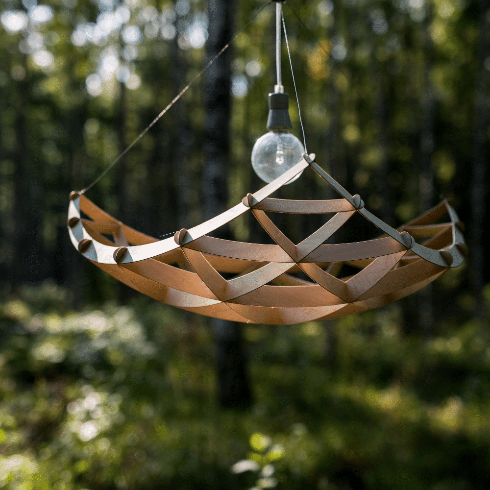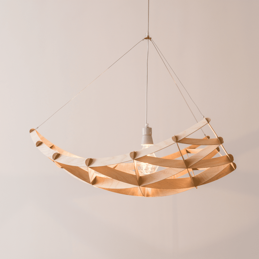 La geometría de la lámpara colgante RAI es aérea y elegante, está ensamblada sin pegamento por un sistema de unión especial. Los arcos se han cortado de un fino contrachapado de aviación de una sección muy pequeña de contrachapado hoja de madera.