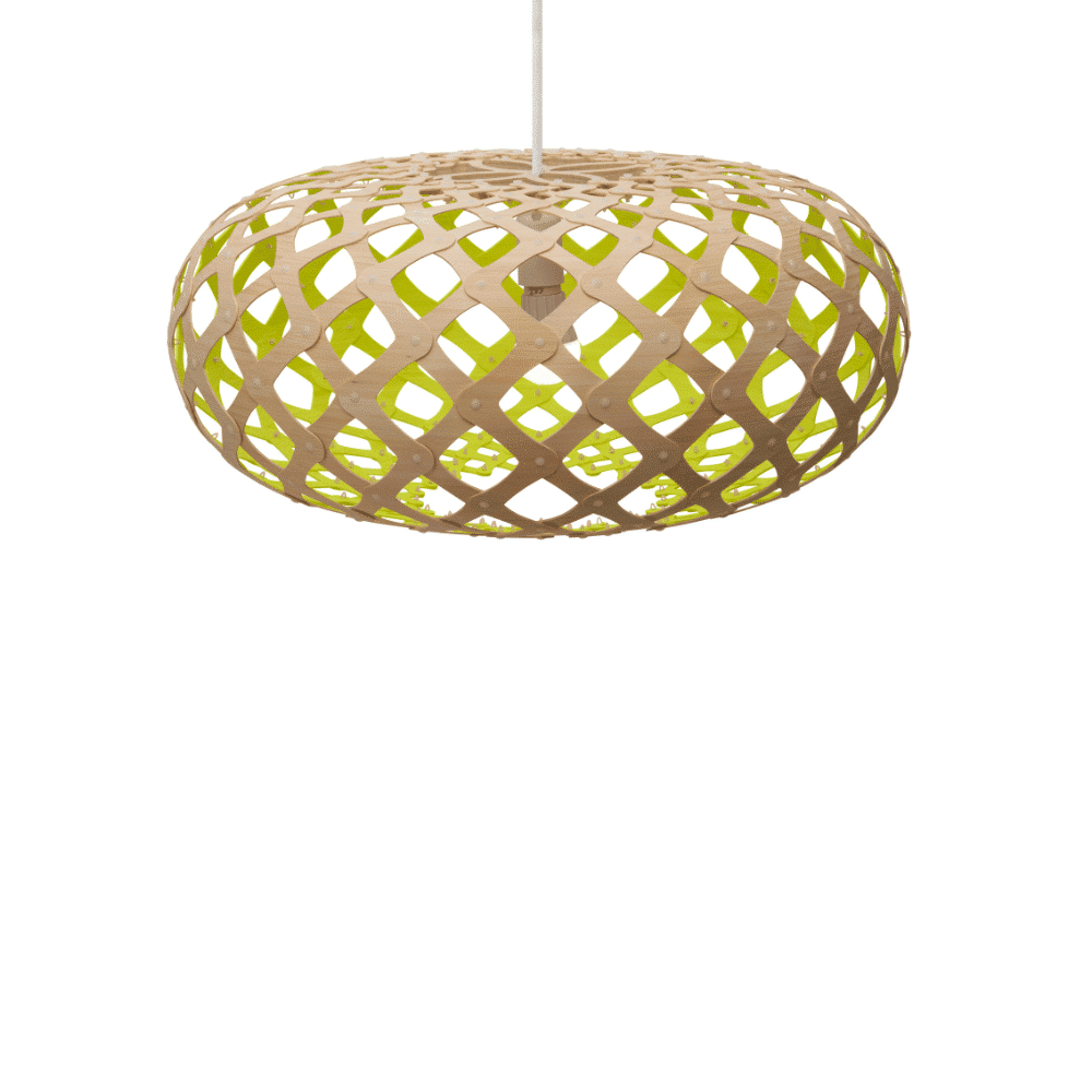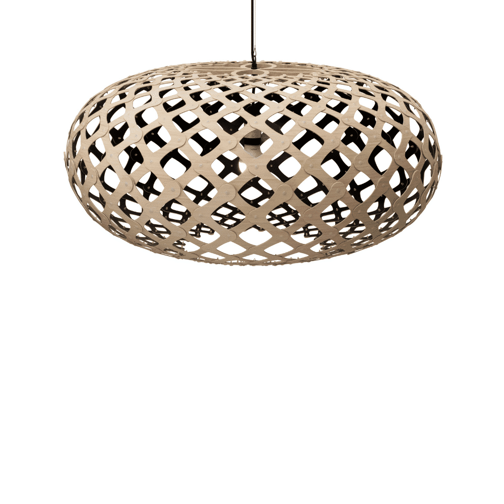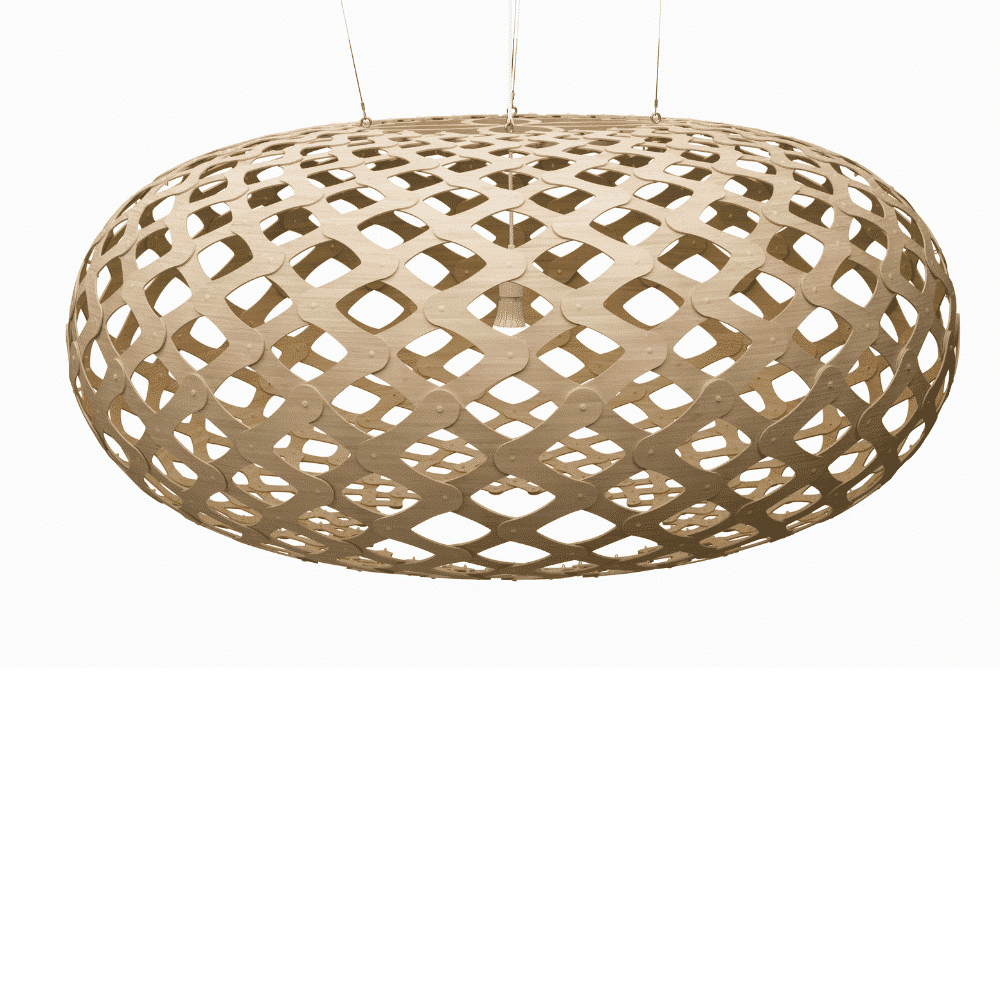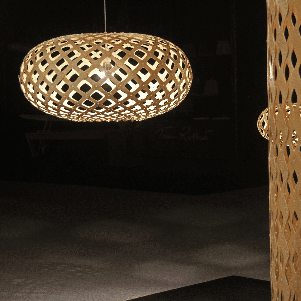 La forma de la lámpara sostenible Kina proviene del caparazón de un erizo de mar, que en Nueva Zelanda es llamado Kina por los indígenas maoríes. David vio uno congelado bajo el hielo de la Antártida durante una visita allí en 2004. El caparazón había absorbido suficiente calor del sol para derretir el hielo que lo rodeaba. Utilizó la misma fórmula matemática que Coral y Floral para desarrollar el diseño y hacer uno de madera contrachapada fina. Kina se utiliza mucho en situaciones de comedor, ya que su apertura permite la entrada de luz clara en la superficie del comedor. Kina tiene un lenguaje tejido con suaves uniones redondeadas, entrelazando el bambú de grano fino. La gama de tamaños hace que Kina sea una opción ideal en cualquier lugar, desde un pequeño dormitorio hasta un gran vestíbulo o sala de espera.