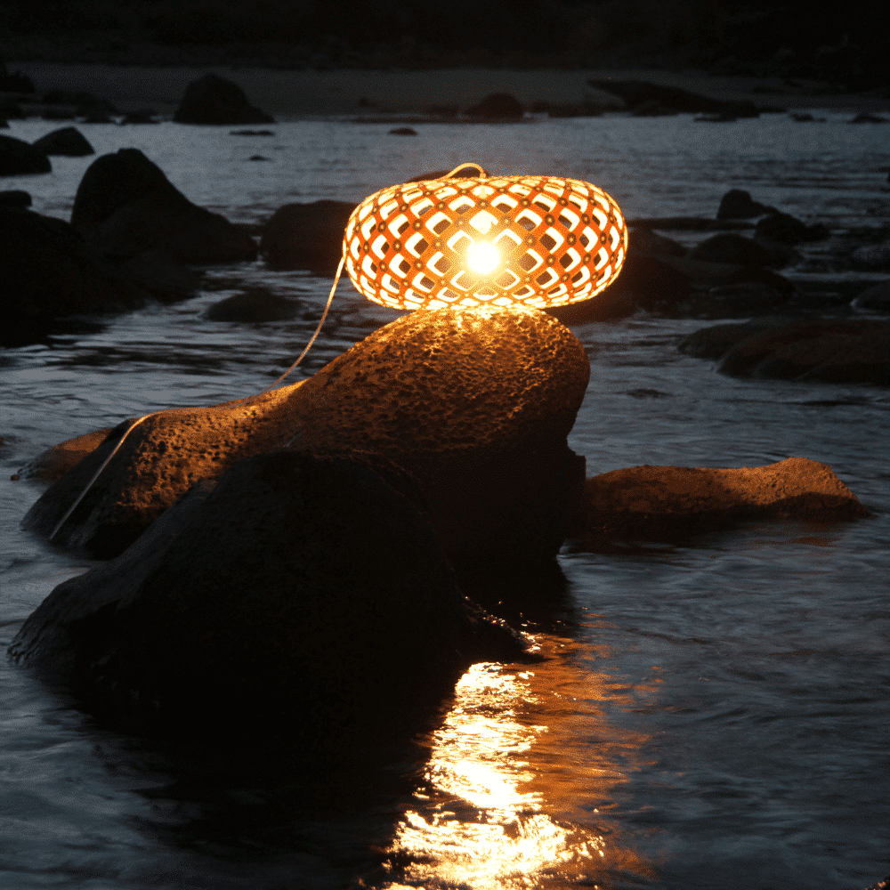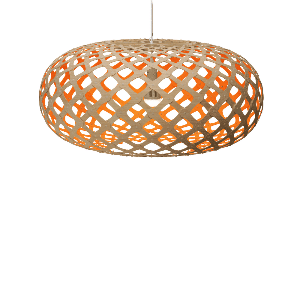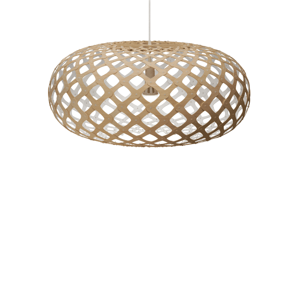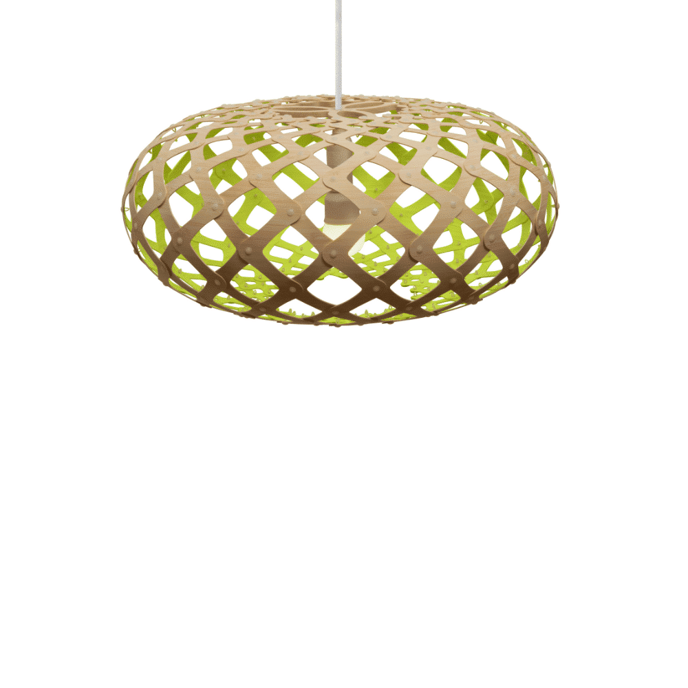 La forma de la lámpara sostenible Kina proviene del caparazón de un erizo de mar, que en Nueva Zelanda es llamado Kina por los indígenas maoríes. David vio uno congelado bajo el hielo de la Antártida durante una visita allí en 2004. El caparazón había absorbido suficiente calor del sol para derretir el hielo que lo rodeaba. Utilizó la misma fórmula matemática que Coral y Floral para desarrollar el diseño y hacer uno de madera contrachapada fina. Kina se utiliza mucho en situaciones de comedor, ya que su apertura permite la entrada de luz clara en la superficie del comedor. Kina tiene un lenguaje tejido con suaves uniones redondeadas, entrelazando el bambú de grano fino. La gama de tamaños hace que Kina sea una opción ideal en cualquier lugar, desde un pequeño dormitorio hasta un gran vestíbulo o sala de espera.