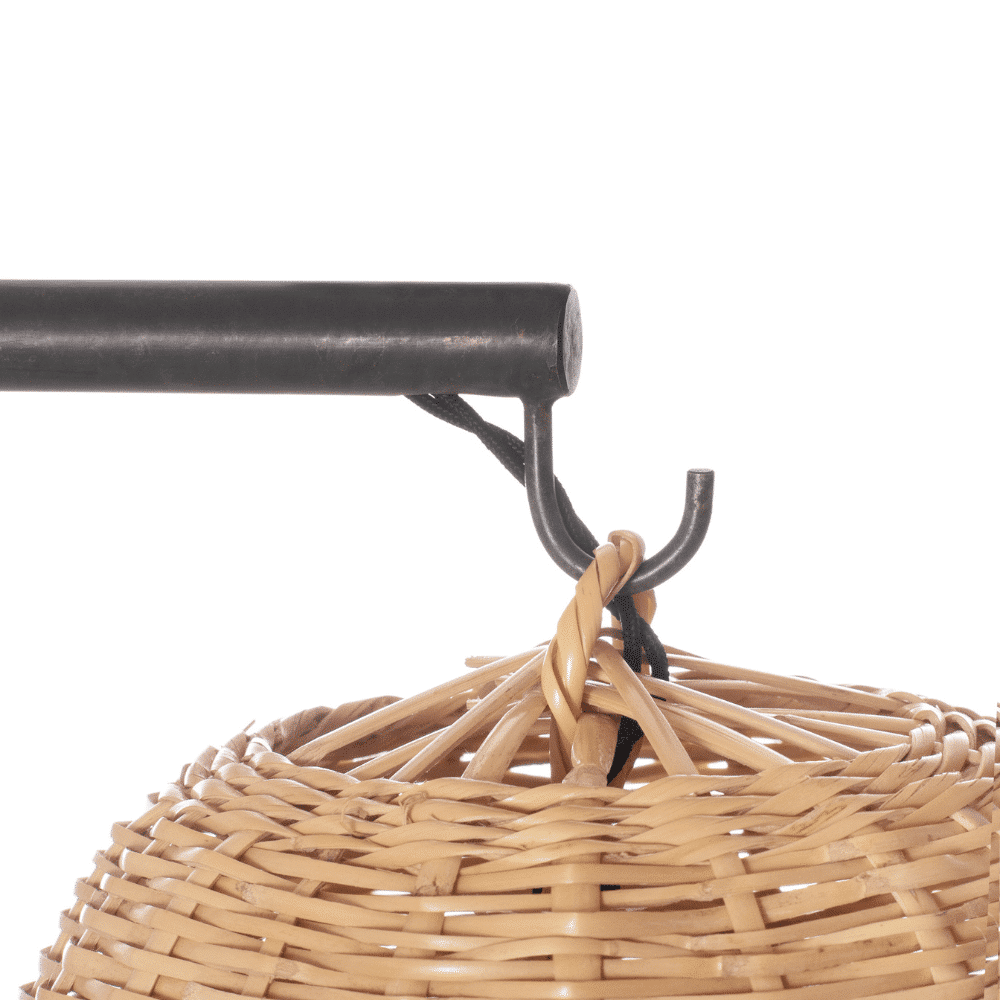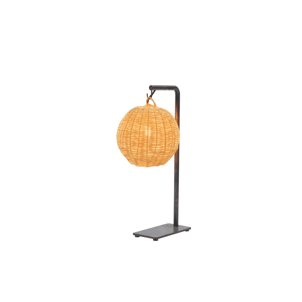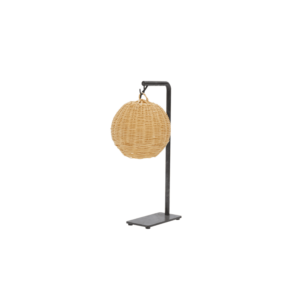 Lámpara de hierro de sobremesa con pantalla de caña. Gracias a la textura del trenzado de caña, proyecta cálidos juegos de luces y sombras a su alrededor.