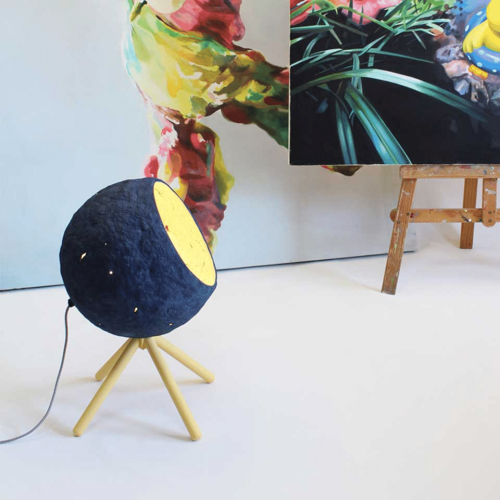 Para las pantallas de estas lámparas sostenibles se utilizan materiales como periódicos reciclados despulpados y pegamento a base de agua aplicando la antigua técnica de papel maché. Este a su vez se tiñe con pigmentos naturales. El papel maché asegura la robustez y resistencia de estas lámparas únicas. Por otro lado, para el pie de la lámpara se utiliza madera natural.