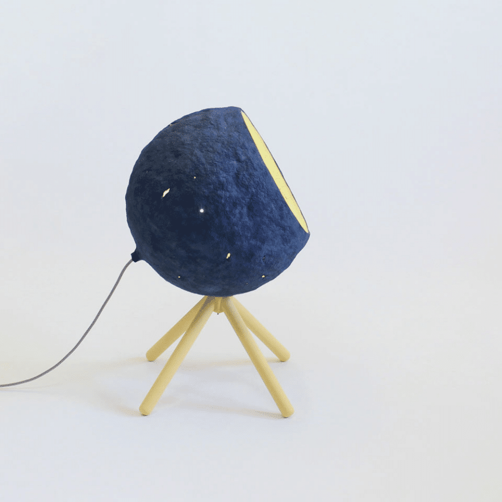 Esta lámpara de pie sostenible está cuidadosamente elaborada a mano con periódicos despulpados reciclados y pegamento a base de agua aplicando la antigua técnica de papel maché. Luego se utilizan pigmentos naturales para colorearla, un cable textil de dos metros para su conexión con la fuente de energía y madera natural para el soporte. Su color azul oscuro genera un ambiente calmo y sofisticado en el espacio de la casa donde se coloque.