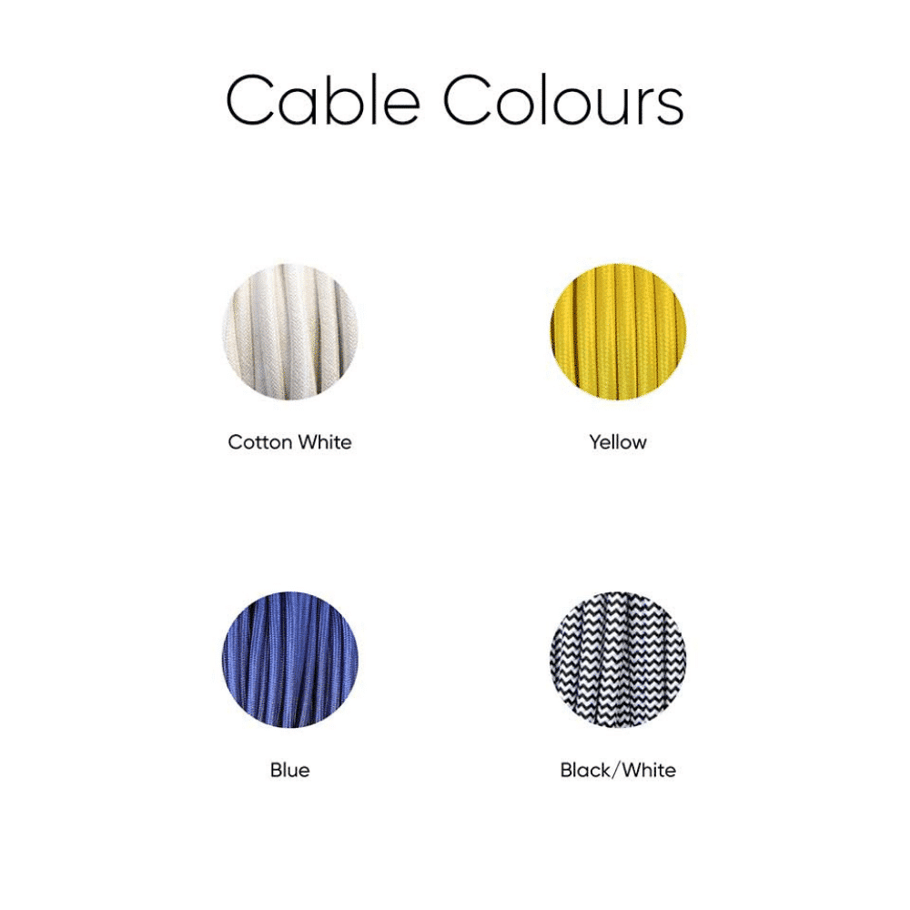 Para su conexión con la fuente de energía, se utiliza un cable textil de dos metro disponible en color amarillo, blanco, azul o blanco y negro. Las lámparas de pie sostenibles Pluto utilizan solo bombillas de luz LED de hasta 20W con terminación E27 (no incluida). Es posible personalizar el color de la lámpara colgante y el color o la longitud del cable a pedido.