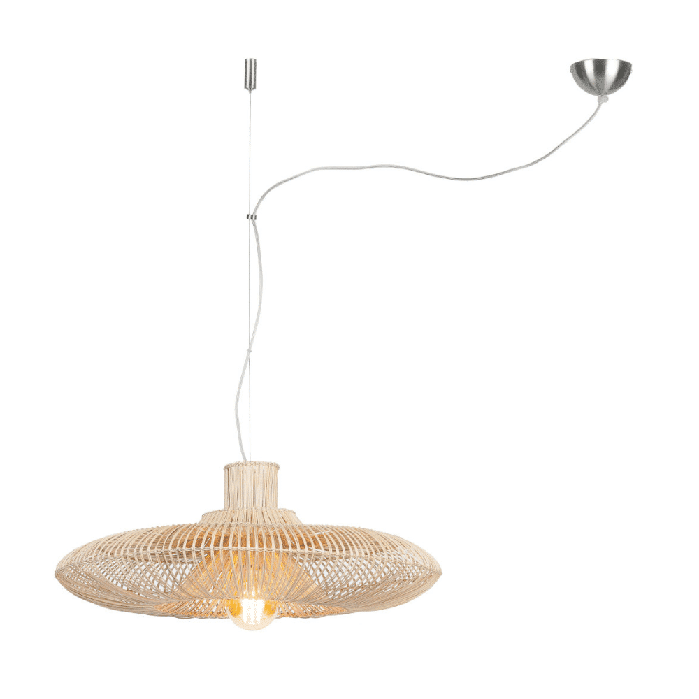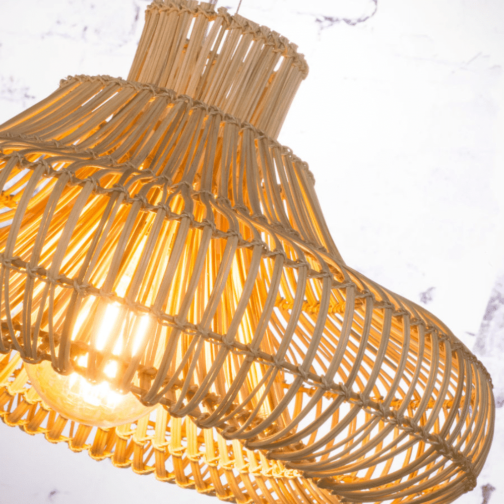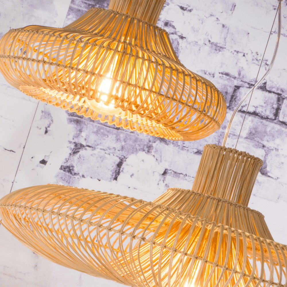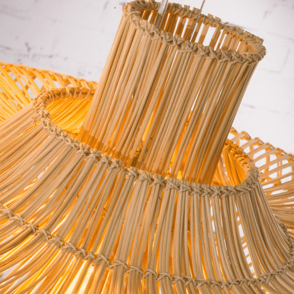 La lámpara de techo colgante Kalahari está hecha de ratán y está inspirada en Kalahari, el semi desierto situado en Sudáfrica con la luz del atardecer brillando sobre las llanuras de hierba.