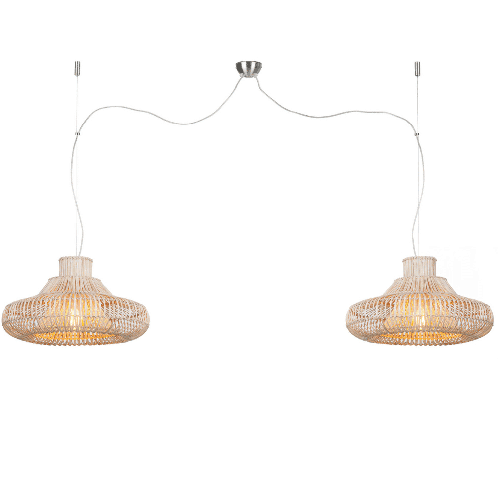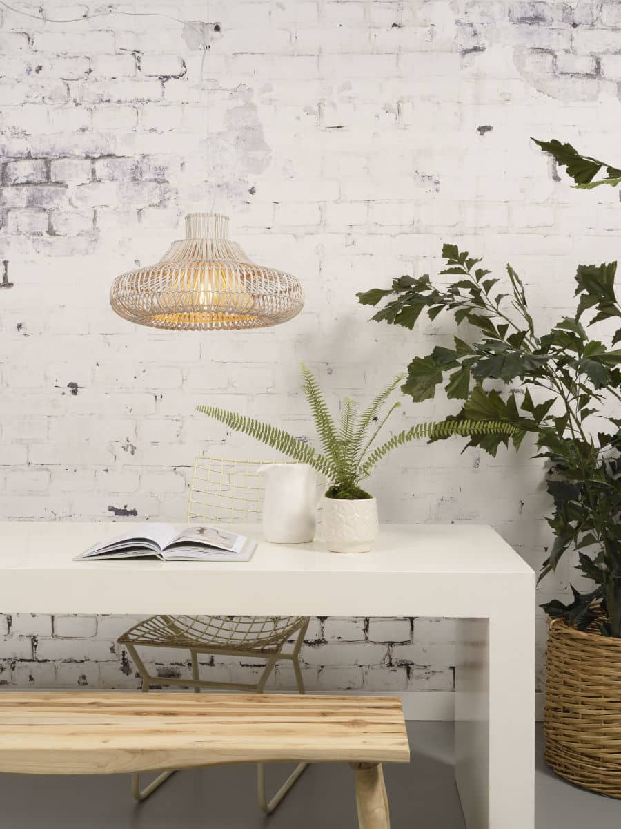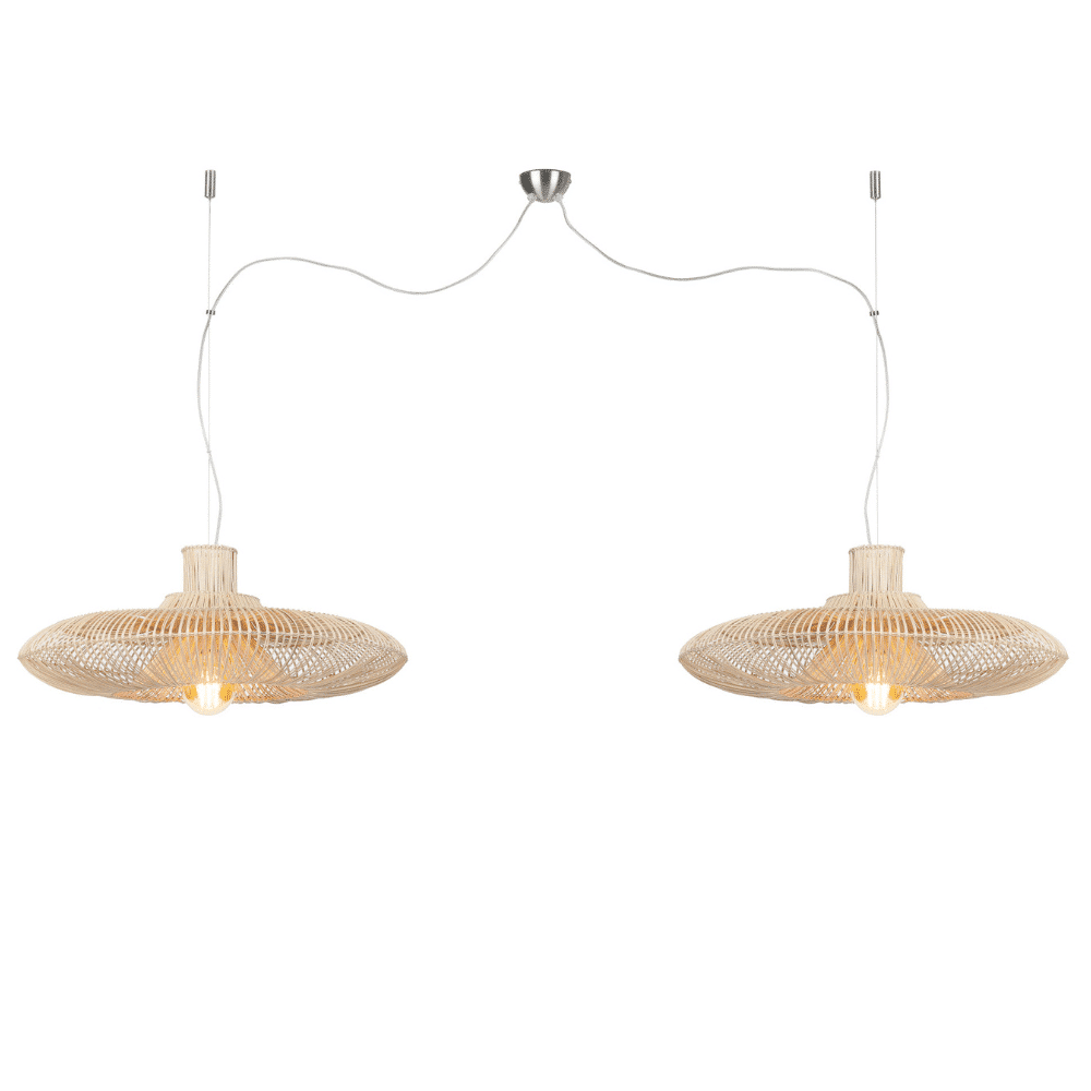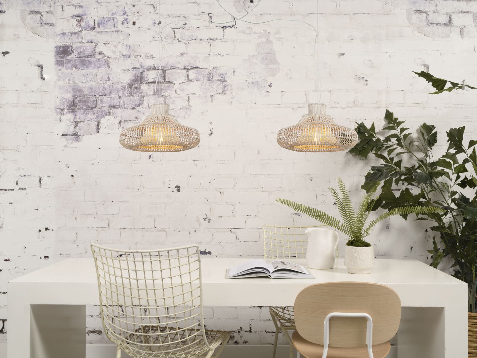 La lámpara de techo colgante Kalahari está hecha de ratán y está inspirada en Kalahari, el semi desierto situado en Sudáfrica con la luz del atardecer brillando sobre las llanuras de hierba.