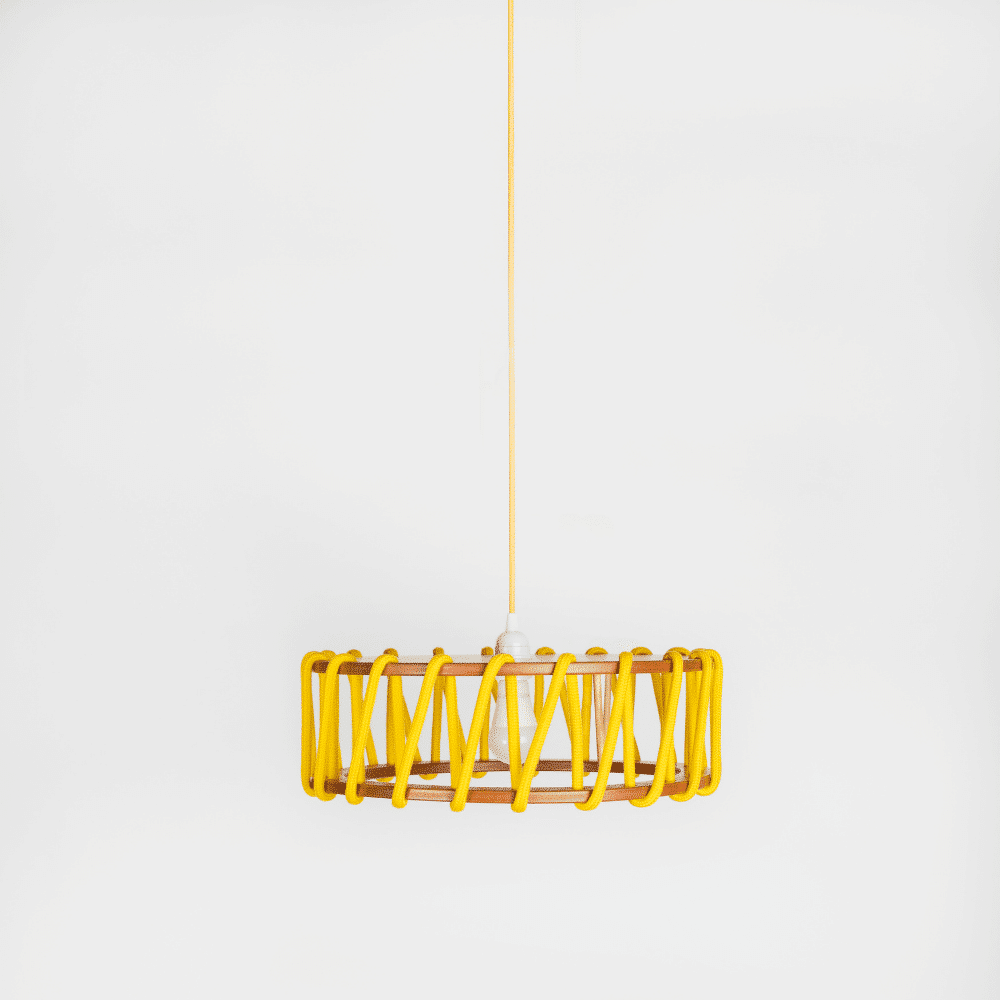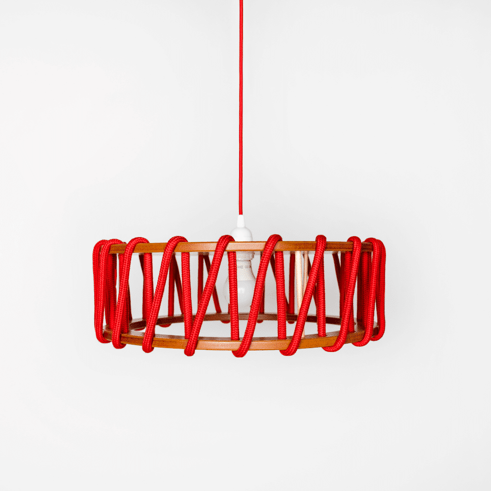 Esta lámpara de techo colgante está realizada con un sólido marco de madera de roble y una cuerda de alta calidad disponible en color azul, negro, rojo, amarillo y blanco. Para la iluminación se debe utilizar una bombilla de luz led (no incluida). Se trata de lámparas de techo que combinan simpáticamente materiales sencillos con las proporciones adecuadas, transformándose en lámparas con una fuerte presencia en decoración con un toque artístico.