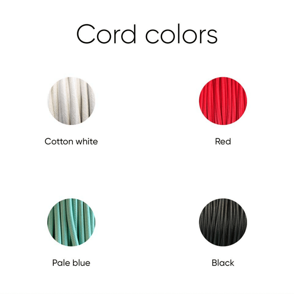 Para su conexión con la fuente de energía se utiliza un cable textil de un metro disponible en color rojo, blanco, negro o verde azulado. Las lámparas colgantes de techo Globe Rustic utilizan solo bombillas de luz LED de hasta 20W con terminación E27 (no incluida). Se puede personalizar el color de la lámpara colgante y el color o la longitud del cable.