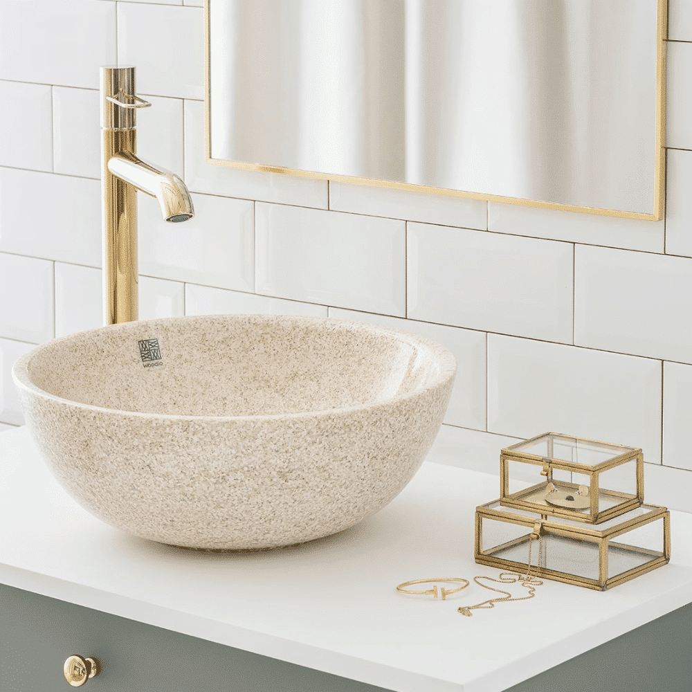 Lavabo de sobremesa Woodio Soft40 fabricado con un compuesto de madera maciza 100% impermeable con una huella de carbono mínima. La madera es un material relajante y armonioso que crea un ambiente fresco y relajante para los interiores de los cuartos de baño.