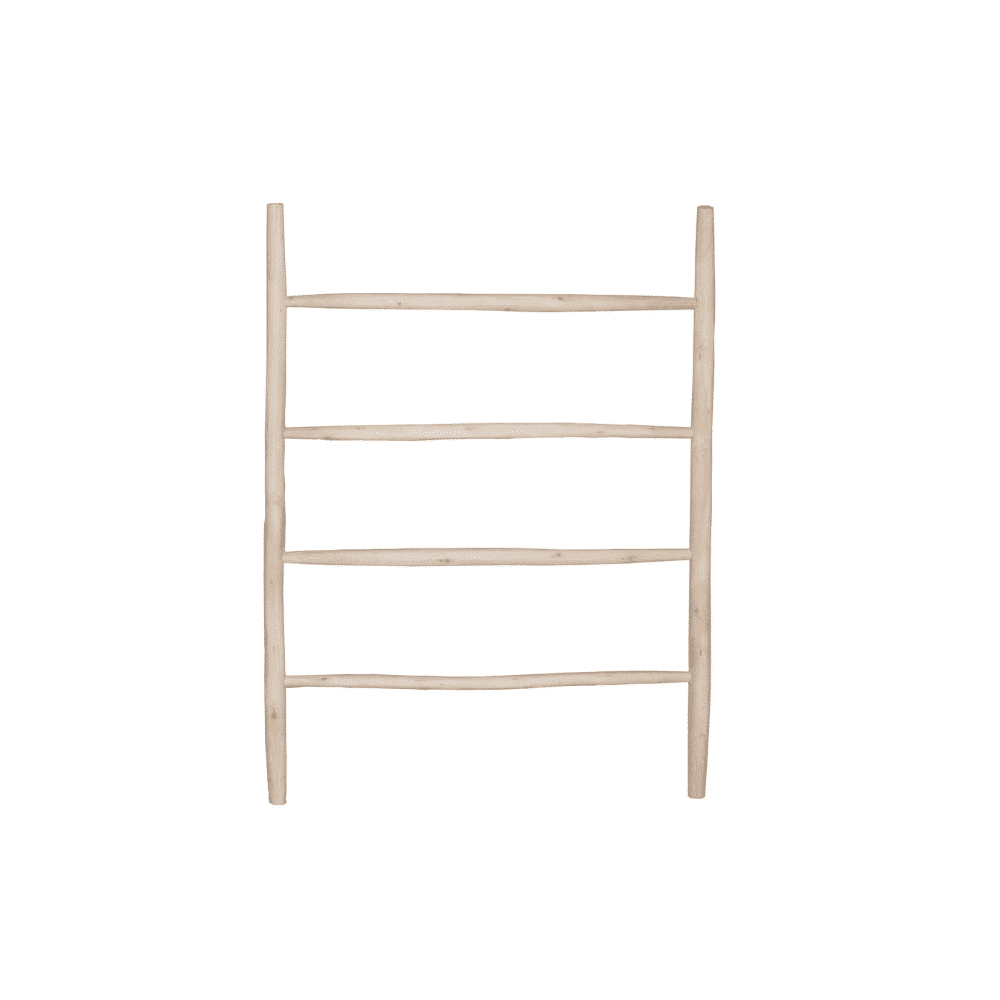 Escalera decorativa ancha de madera de álamo, cortada y trabajada a mano por artesanos expertos. Se puede usar en el baño para colgar toallas, en el dormitorio como colgador, en la sala de estar, la cocina o el recibidor para colgar macetas con plantas o cestas. El color claro de la madera aporta luz y calidez en cualquier espacio.