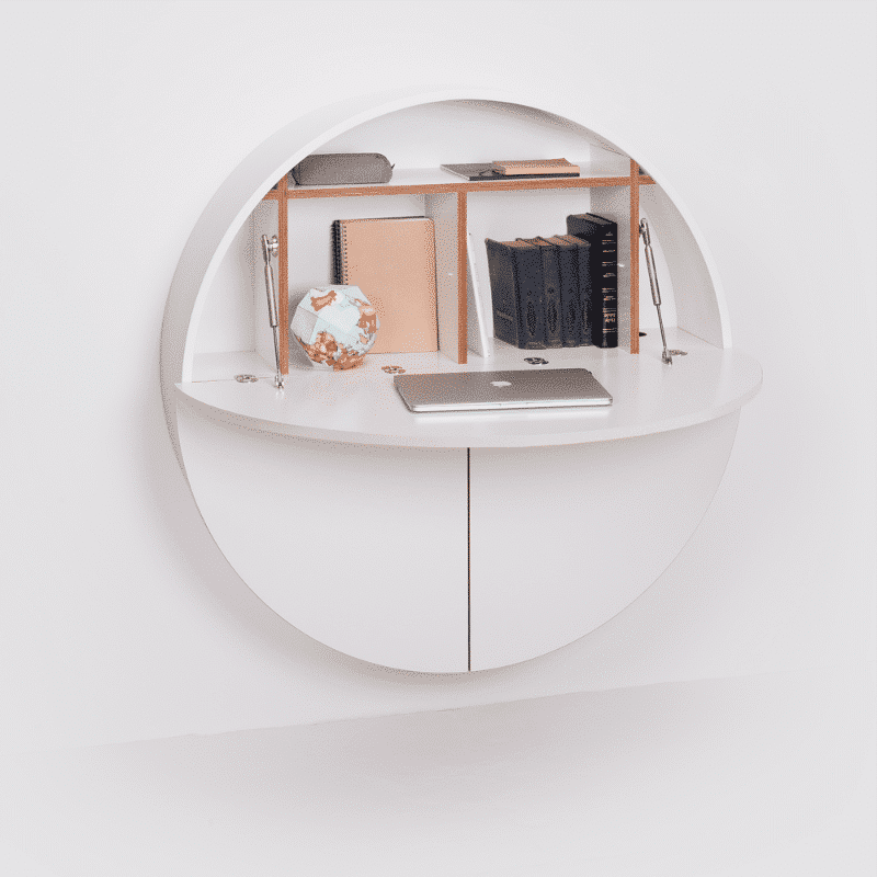 La píldora multifuncional funciona muy bien en el tratamiento contra el desorden y los ambientes sucios.La píldora es un gabinete redondo que funciona fijado a una pared y puede transformar instantáneamente en un lugar de trabajo totalmente funcional, un tocador, o incluso un bar!