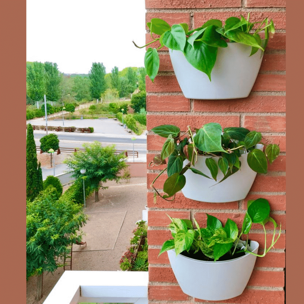 Pack de 3 macetas de pared para interior y exterior con autorriego por capilaridad. Fabricado en Alicante con polipropileno 100% reciclado y reciclable.