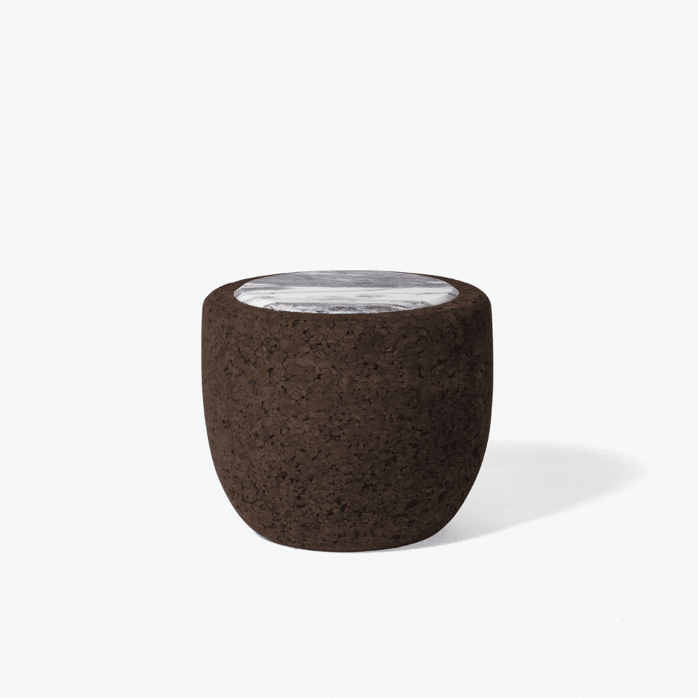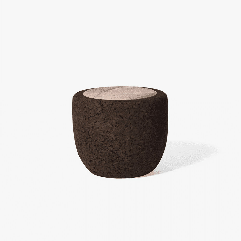 Compuesta por una semiesfera de corcho oscuro aglomerado que evoca la corteza terrestre, MAGMA presenta un tablero de piedra con expresivas vetas.