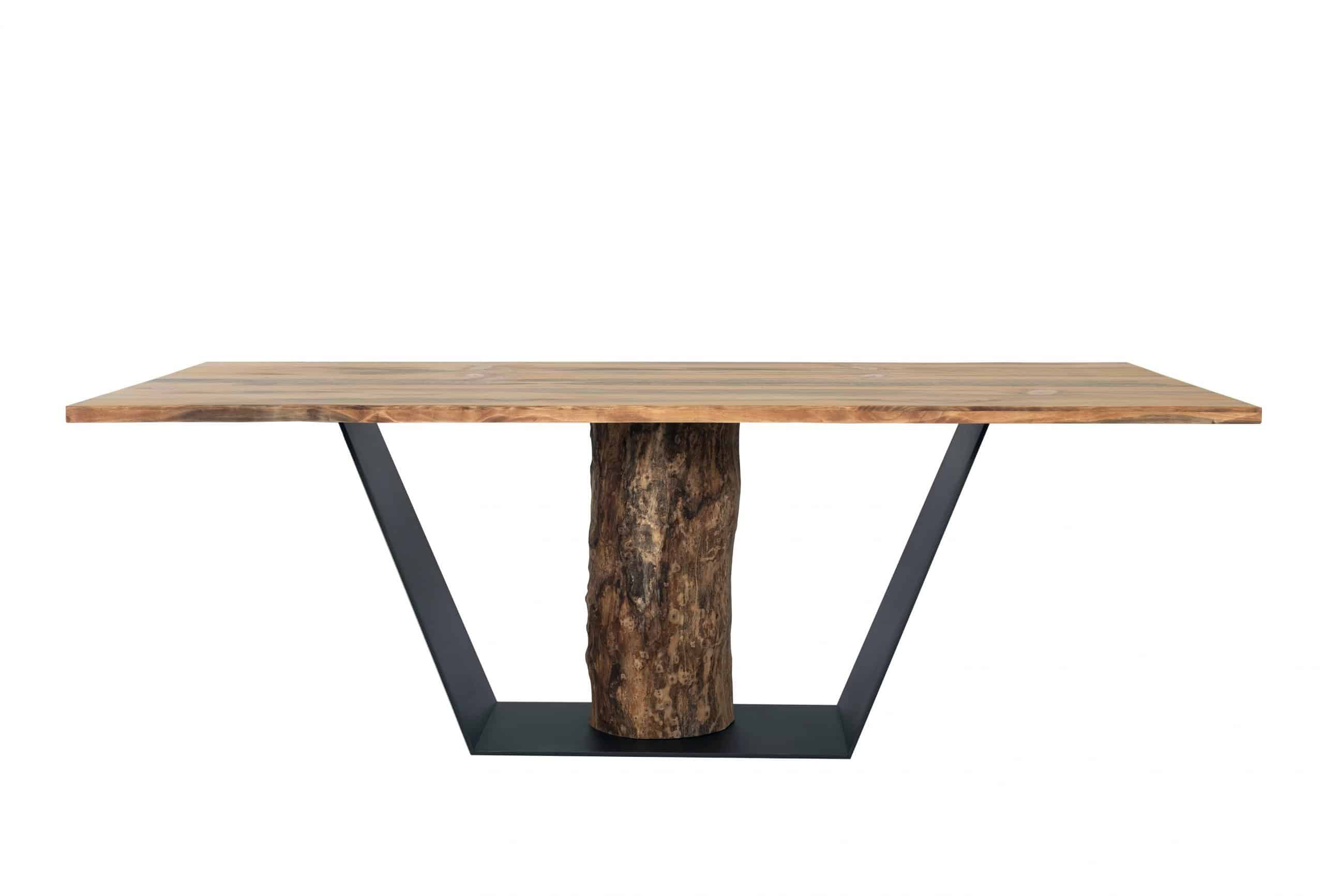 La idea del diseño de la mesa de comedor Arbore surge como alegoría al elemento del que emana todo este proyecto, y no es otro que el árbol. Por ello se utiliza un tronco macizo de Madera de Cedro de Busaco, en el que solo se ha quitado la corteza del mismo, como soporte de la mesa.