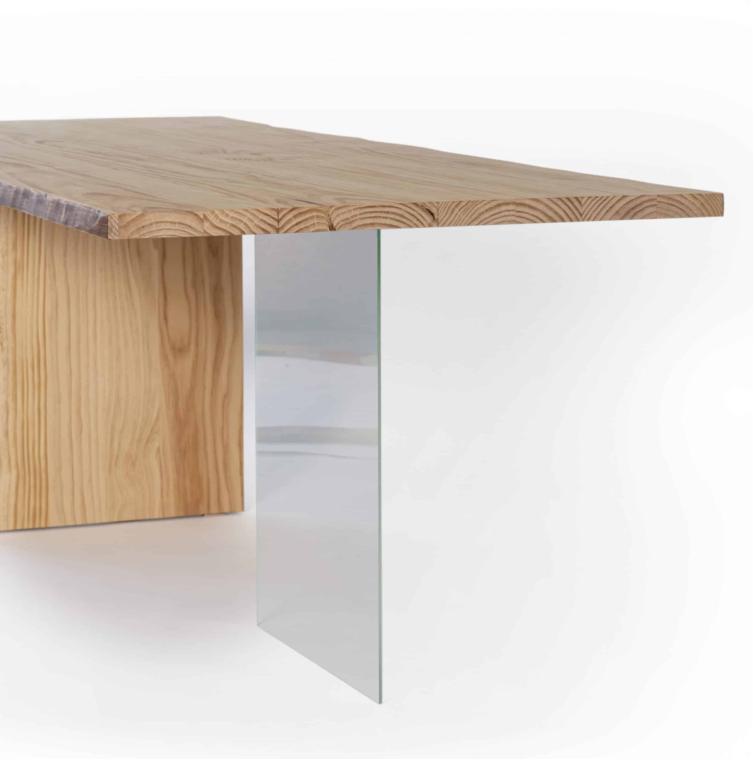 Su base, esta formada por dos soportes, uno de vidrio, paralelo a la forma longitudinal de la mesa, y otro de madera, del mismo material y acabado que el perímetro del tablón.