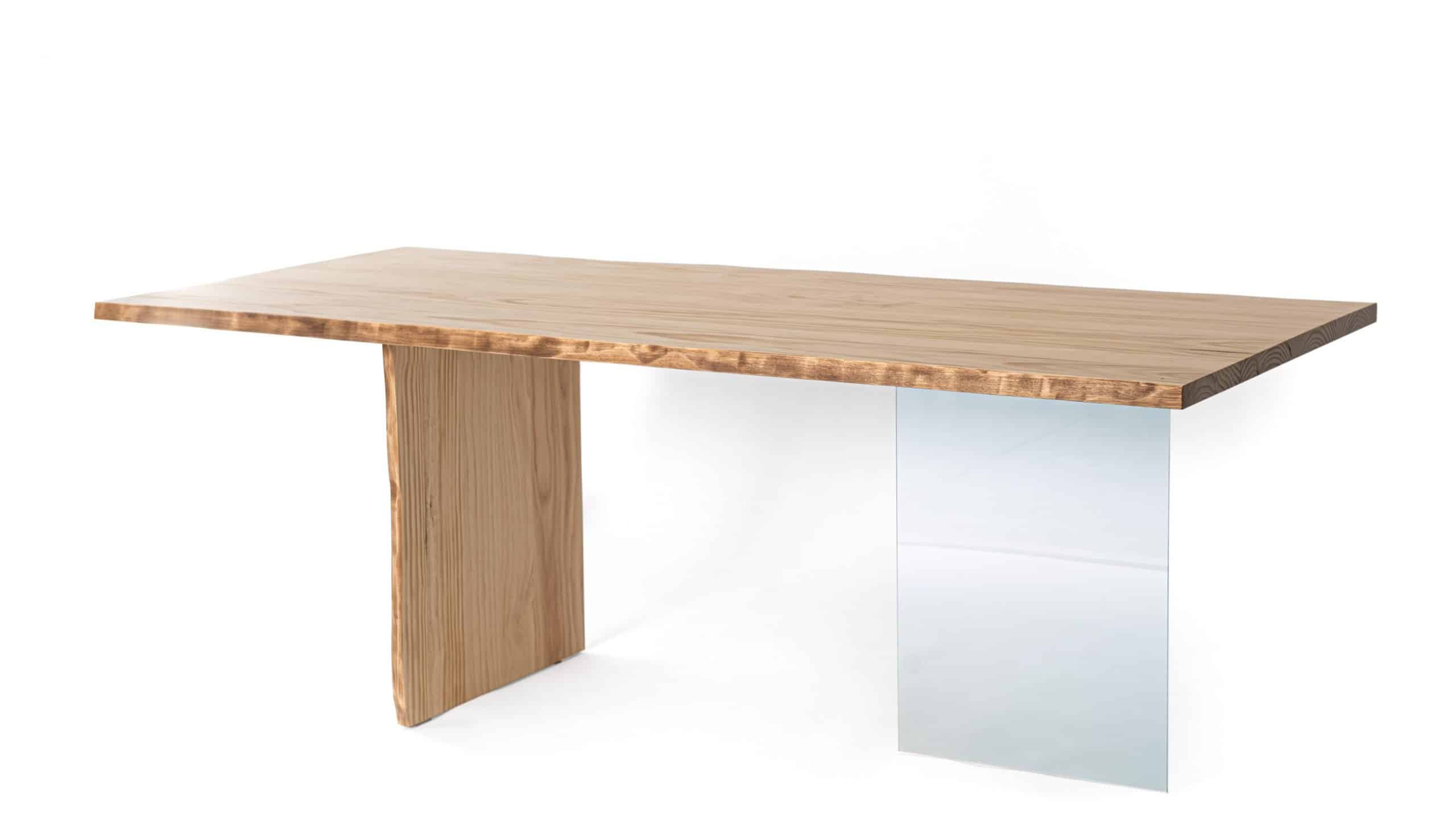 El tablero de la mesa de comedor Ponte, esta formado por varios tablones colocados sucesivamente encolados, siendo su perímetro ligeramente irregular, siguiendo la forma natural del tablón.