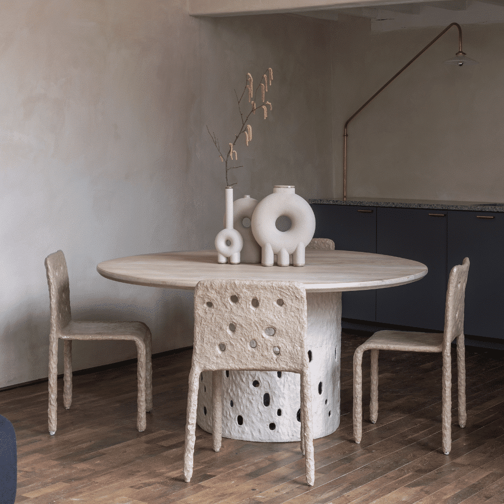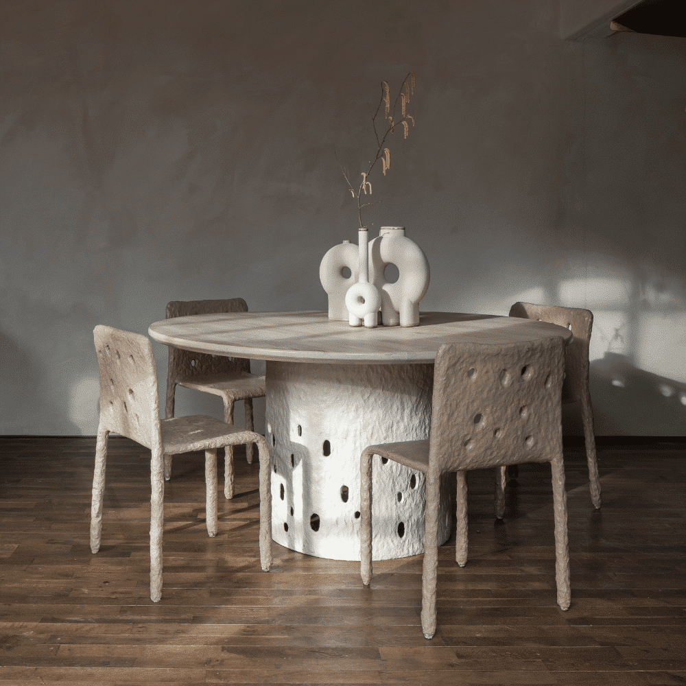Mesa ZTISTA – la pata, esculpida a mano del material epónimo de FAINA – ZTISTA una mezcla sostenible de arcilla, heno y otros materiales reciclados, diseñada para volver algún día a la naturaleza. ZTISTA es tactilidad, energía pura, sensaciones viscerales. Espontánea y emocional, la mesa ZTISTA presenta un tablero de fresno vivo y los característicos agujeros.