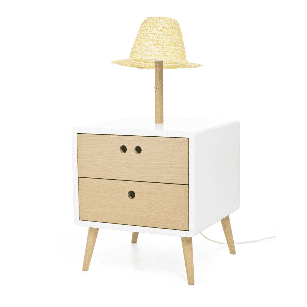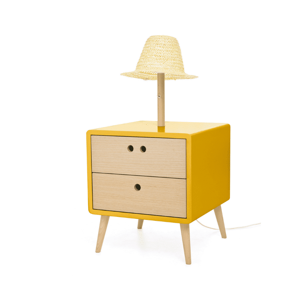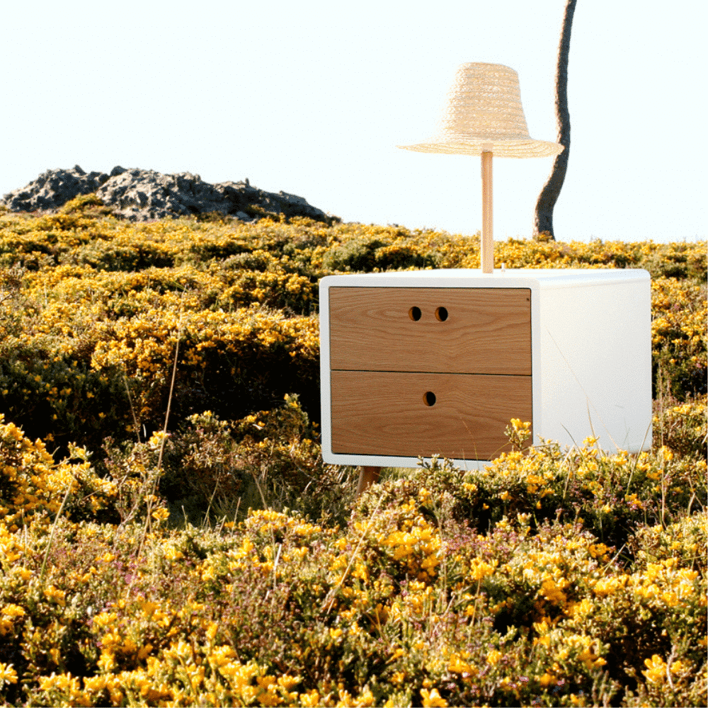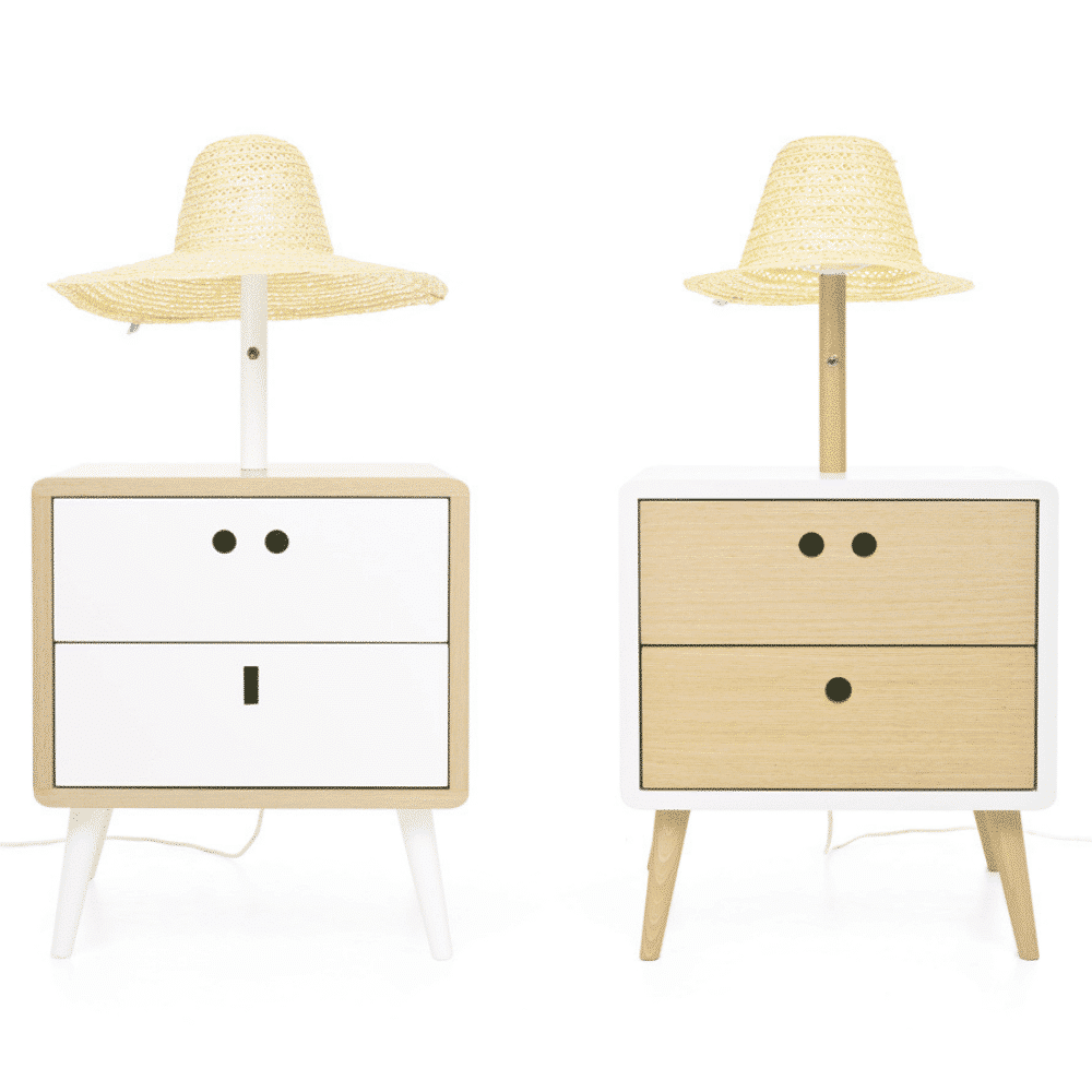 La mesita de noche con lámpara Nel explora la cuestión del género y tiene un carácter humano y humorístico. La pantalla representa el sombrero de paja masculino, típico de la región portuguesa del Bajo Minho. Los tiradores acentúan la intención humorística porque María (la otra mesa auxiliar) habla demasiado y Nel se asombra con su discurso.