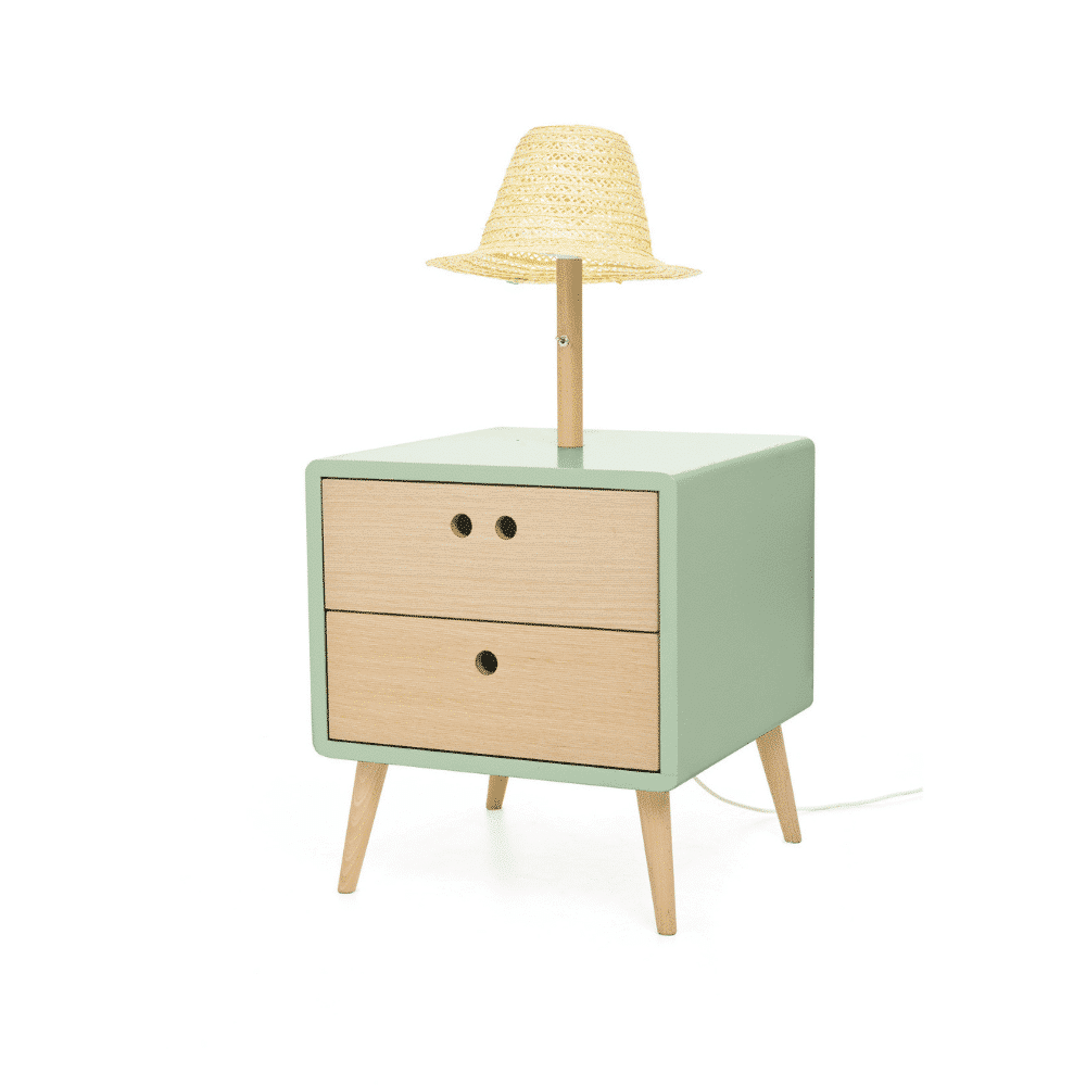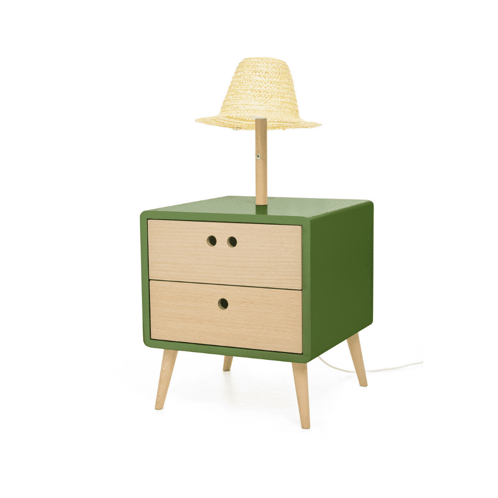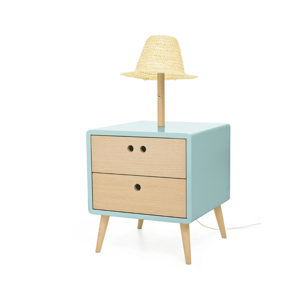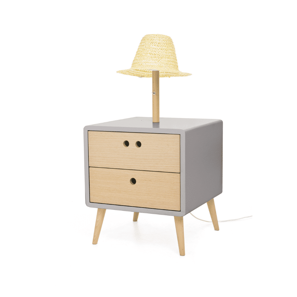 La mesita de noche con lámpara Nel explora la cuestión del género y tiene un carácter humano y humorístico. La pantalla representa el sombrero de paja masculino, típico de la región portuguesa del Bajo Minho. Los tiradores acentúan la intención humorística porque María (la otra mesa auxiliar) habla demasiado y Nel se asombra con su discurso.