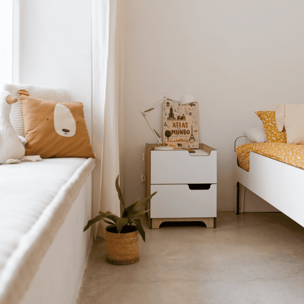 Por utilidad, la mesita de noche debería ser la encargada de guardar libros y apoyar lámparas. Pero siendo sinceros, acabará siendo el refugio de los secretos, los tesoros y las pertenencias más preciadas de tus hijos.