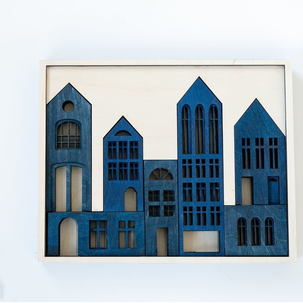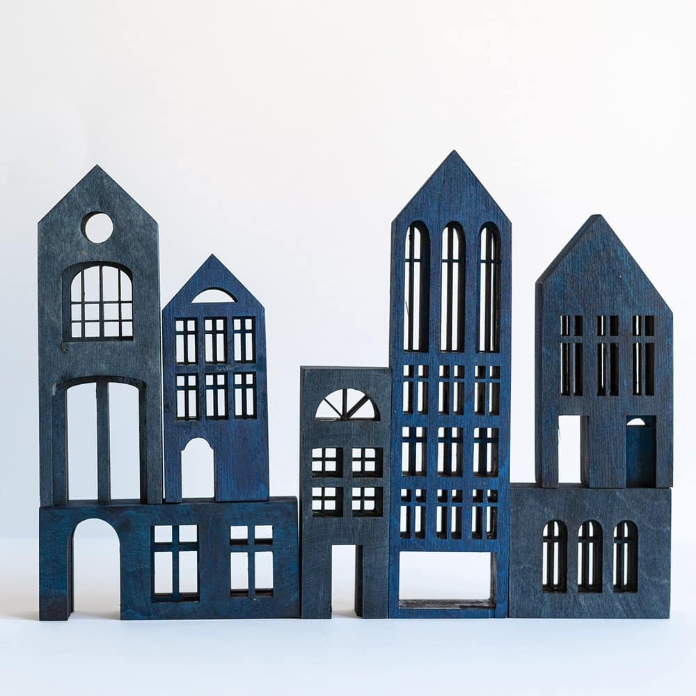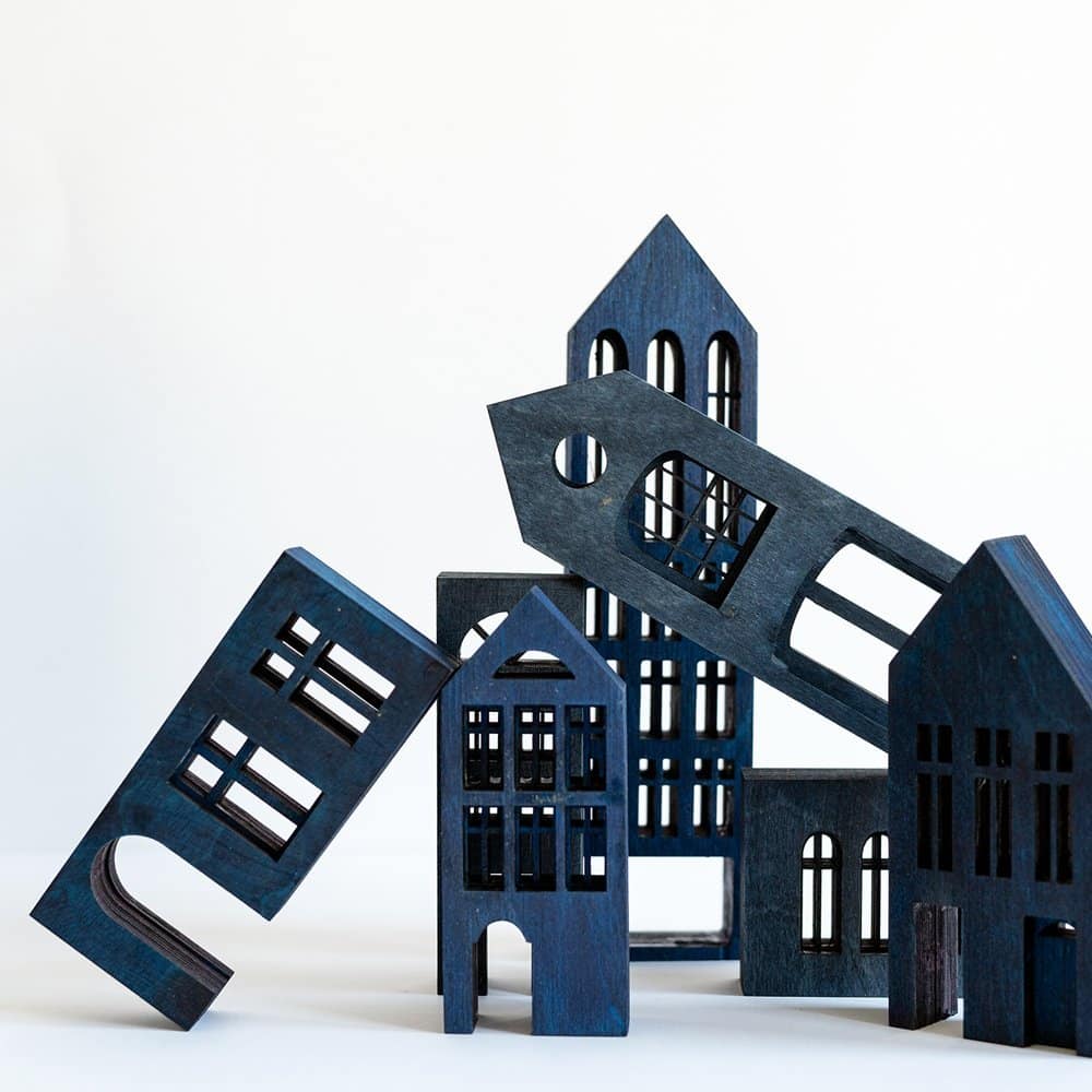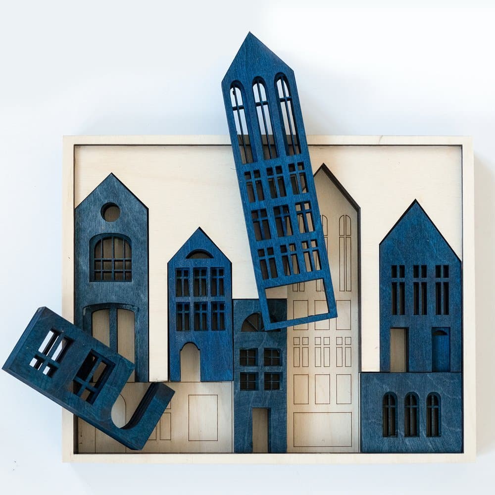 Estos bloques funcionan, a primera vista, como el clásico rompecabezas, presentado en su caja de madera contrachapada de abedul certificada 100% sostenible y bellamente hecha a mano, pero también pueden combinarse y volver a ensamblarse para crear ciudades, donde habiten figuras de lego, personajes de acción y muñecas de barbie. Los ladrillos son lo suficientemente anchos como para sostenerse solos, por lo que es fácil construirlos en altura. Cada ladrillo es cortado a medida, lo que le da a las casas un carácter distintivo y profundidad.
