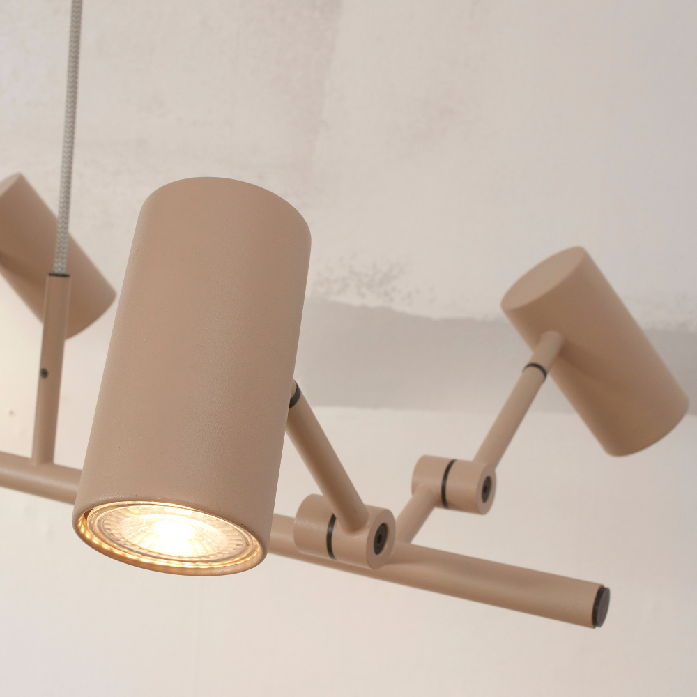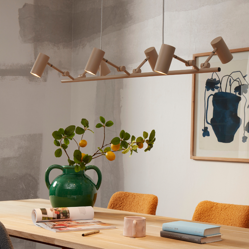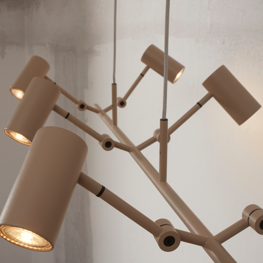 Montreux es una lámpara de techo colgante grande con 6 lámparas color arena ideal para decorar salones y comedores. Los colores y formas dan un toque cálido a cualquier estancia principal de la casa.