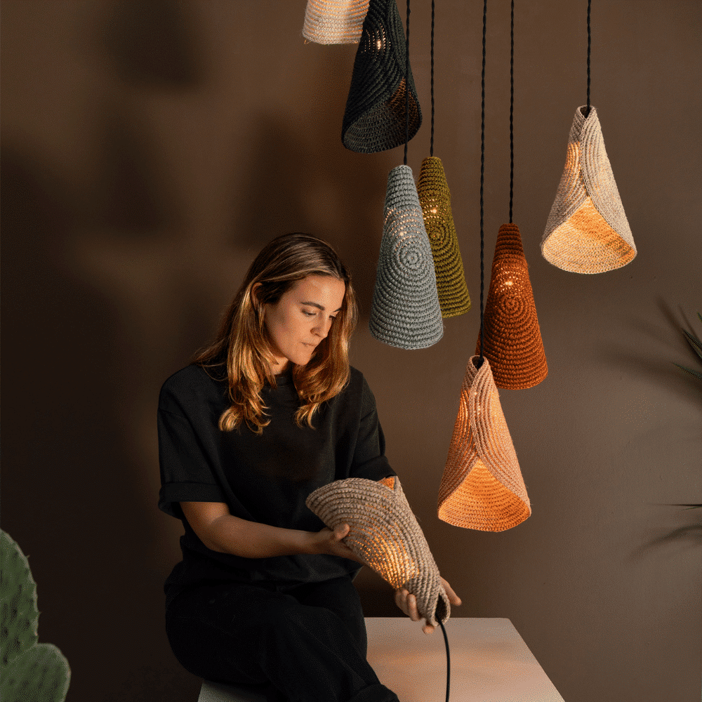 Pantalla de fique tejida con la técnica de ganchillo. La colección de lámparas CORNETA de Let’s Pause es un homenaje a la artesanía sabia y canta a la sencillez: un doble hilo va uniendo con la técnica de crochet el alma y estructura de la pantalla, una cuerda de 12 hilos retorcida. Una vez tejida la pantalla se une en forma de caracola de mar y haciendo que la luz que proyecta sea muy focalizada. Está disponible en tres colores distintos: rosa nude, marrón claro y negro.