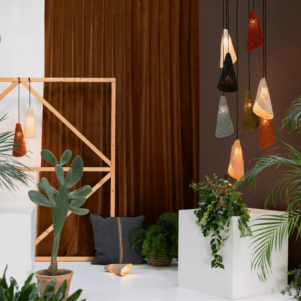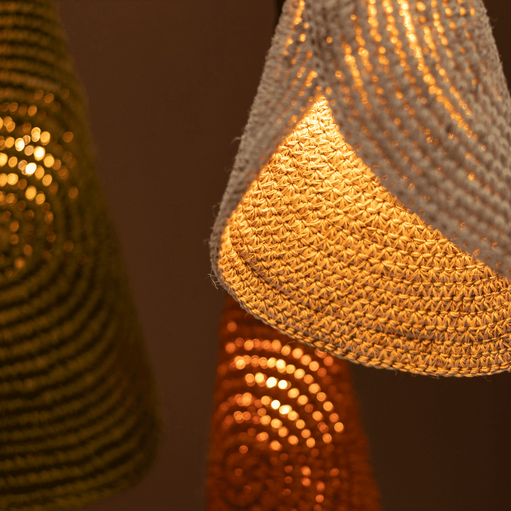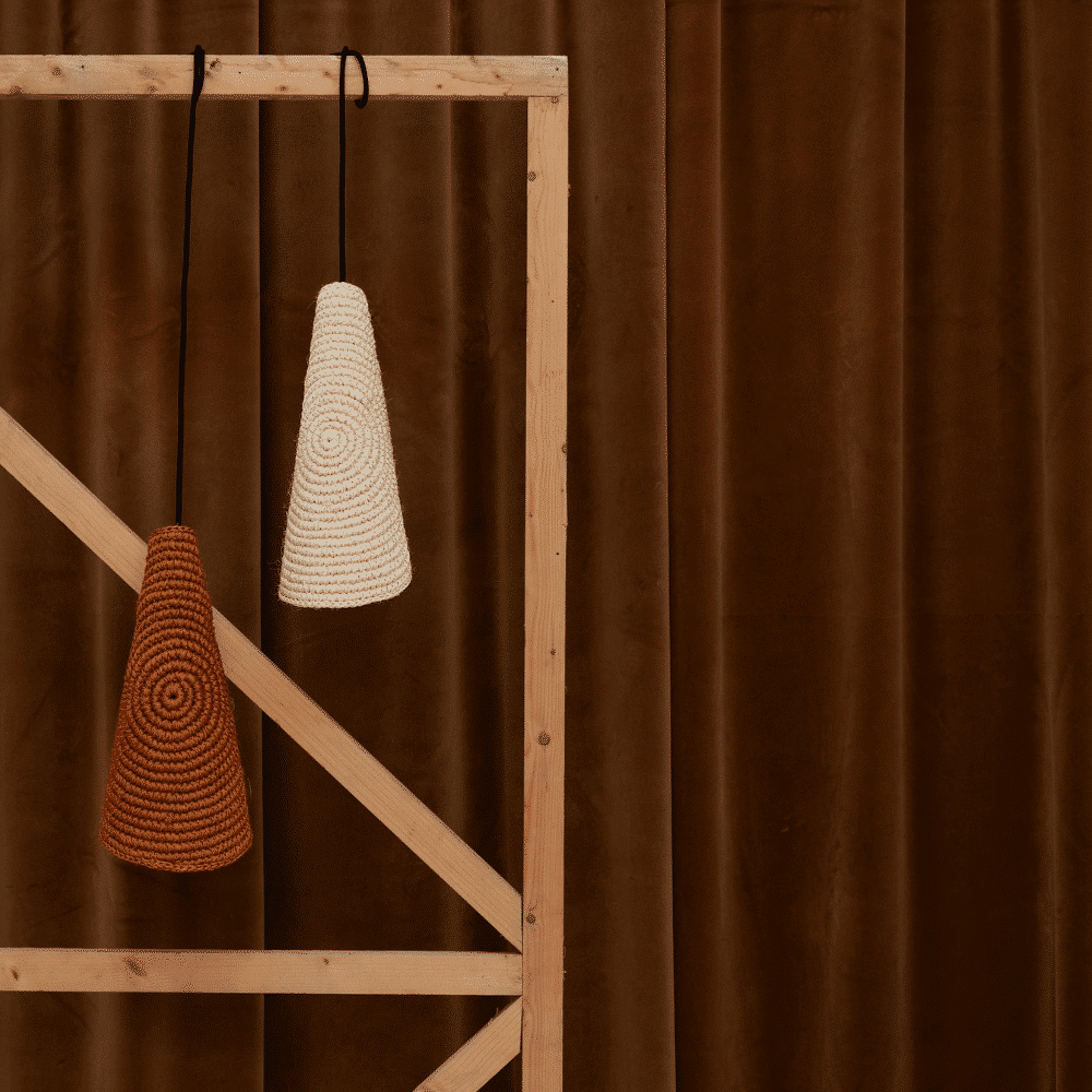 Pantalla de fique tejida con la técnica de ganchillo. La colección de lámparas CORNETA de Let’s Pause es un homenaje a la artesanía sabia y canta a la sencillez: un doble hilo va uniendo con la técnica de crochet el alma y estructura de la pantalla, una cuerda de 12 hilos retorcida.
